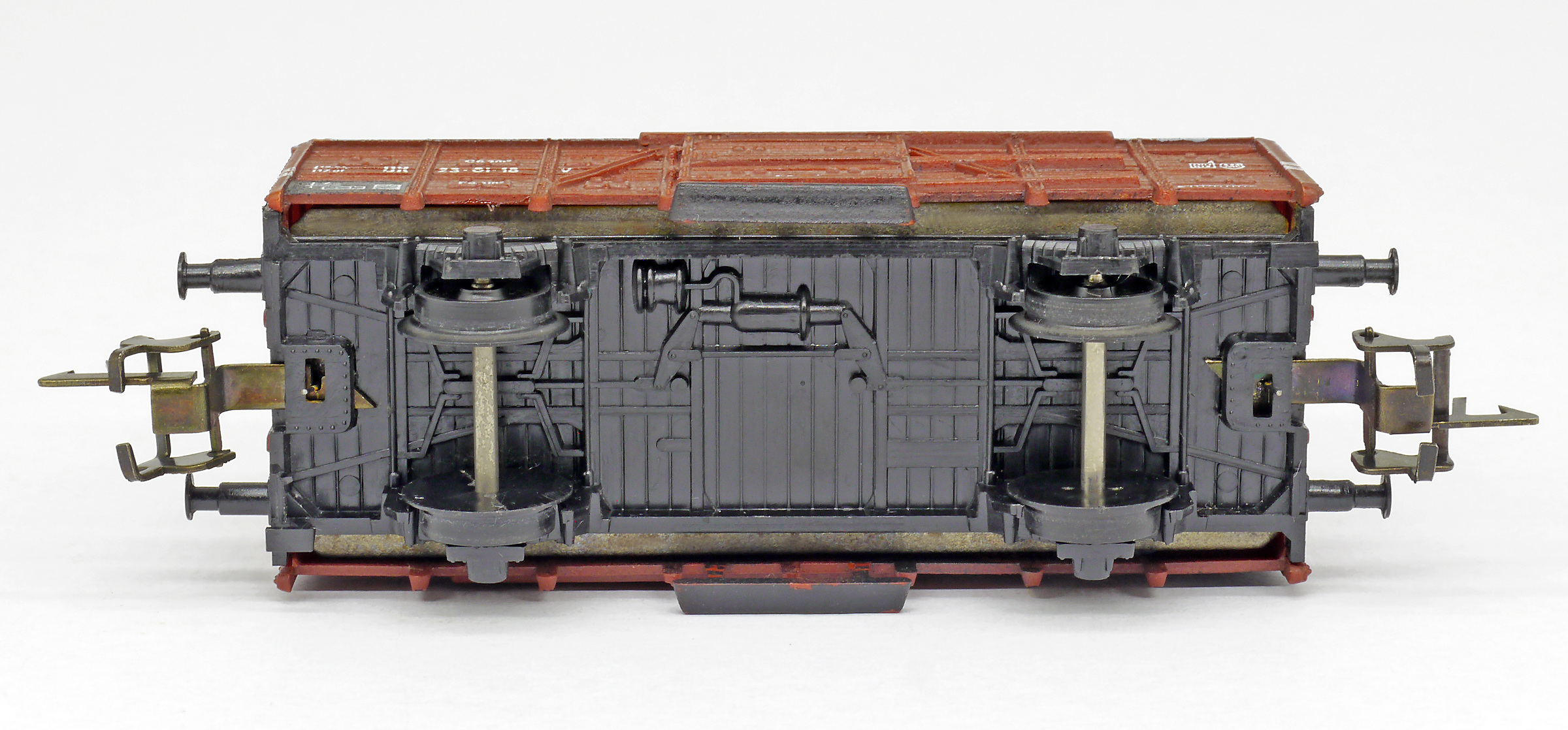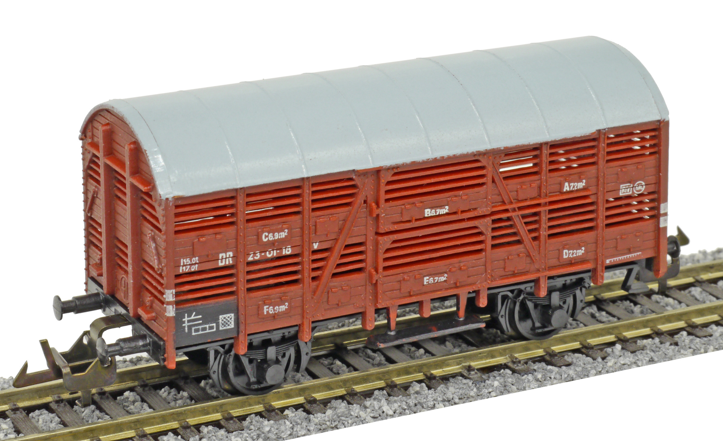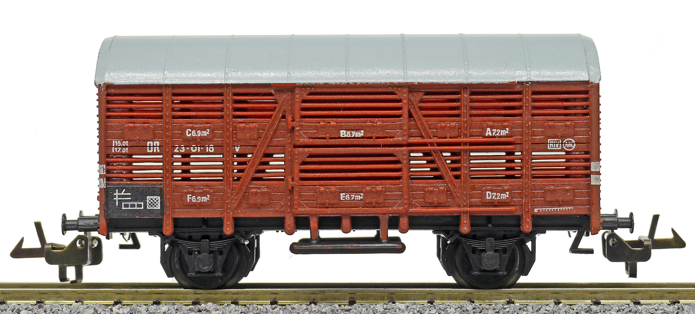 nákladní vůz na přepravu zvířat červenohnědý s šedou střechou