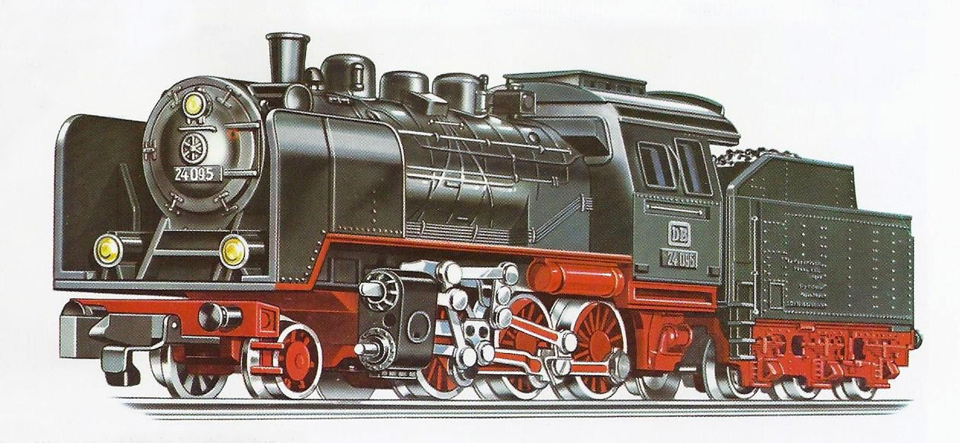 | parní lokomotiva černá s červeným pojezdem a s kouřovými plechy |