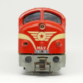 | dieselová lokomotiva červená s černým pojezdem |