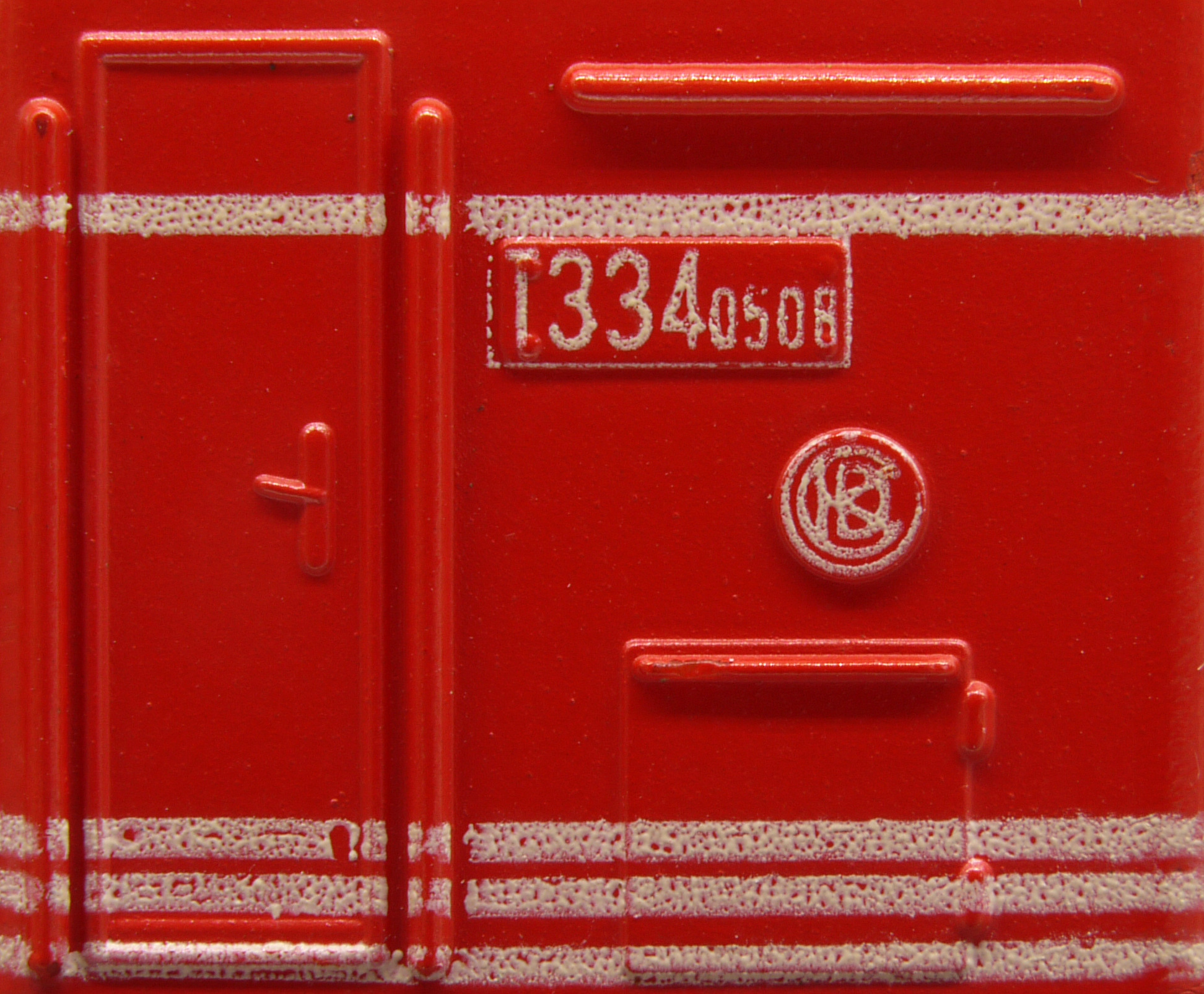 | dieselová lokomotiva červená s bílými proužky, krémová budka, černý rám a pojezd |