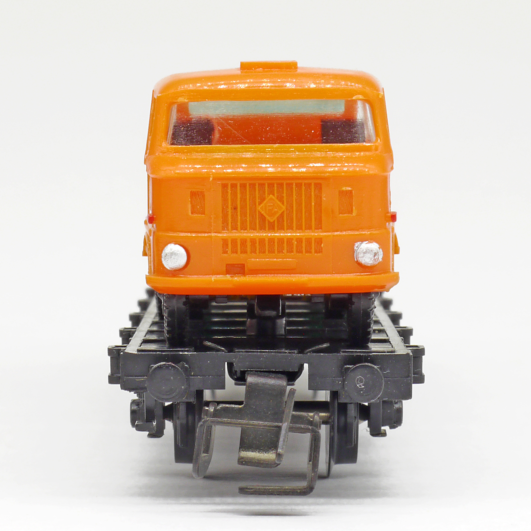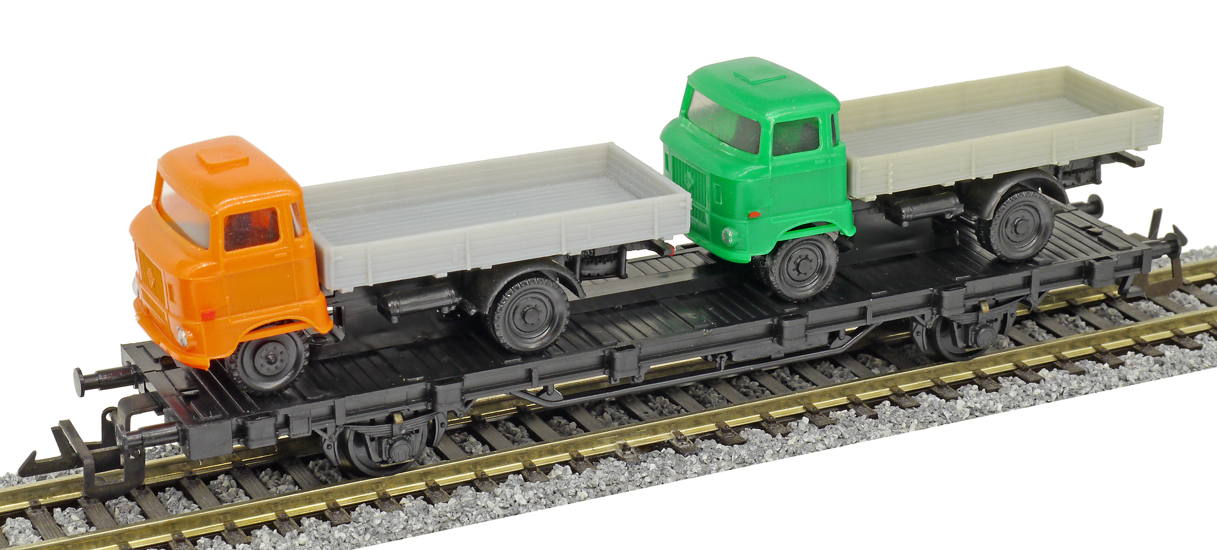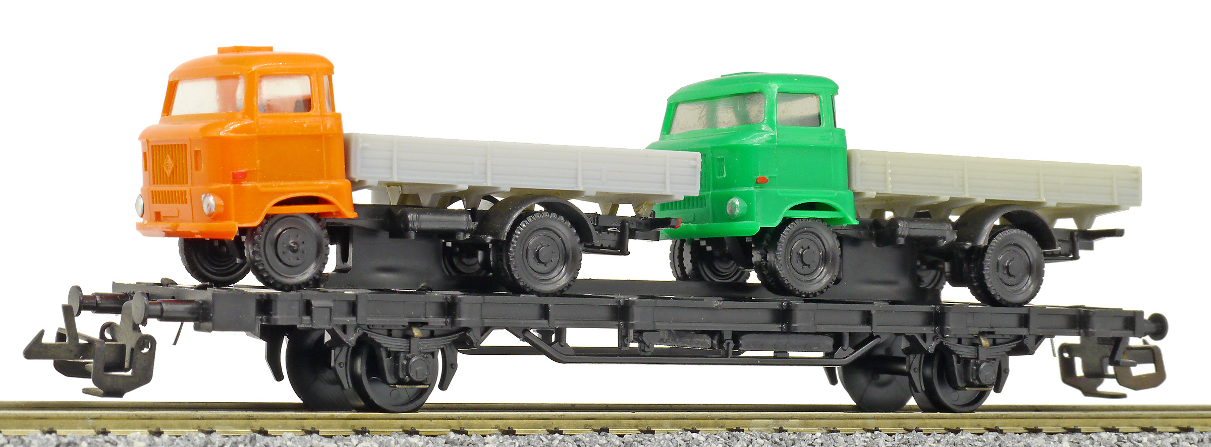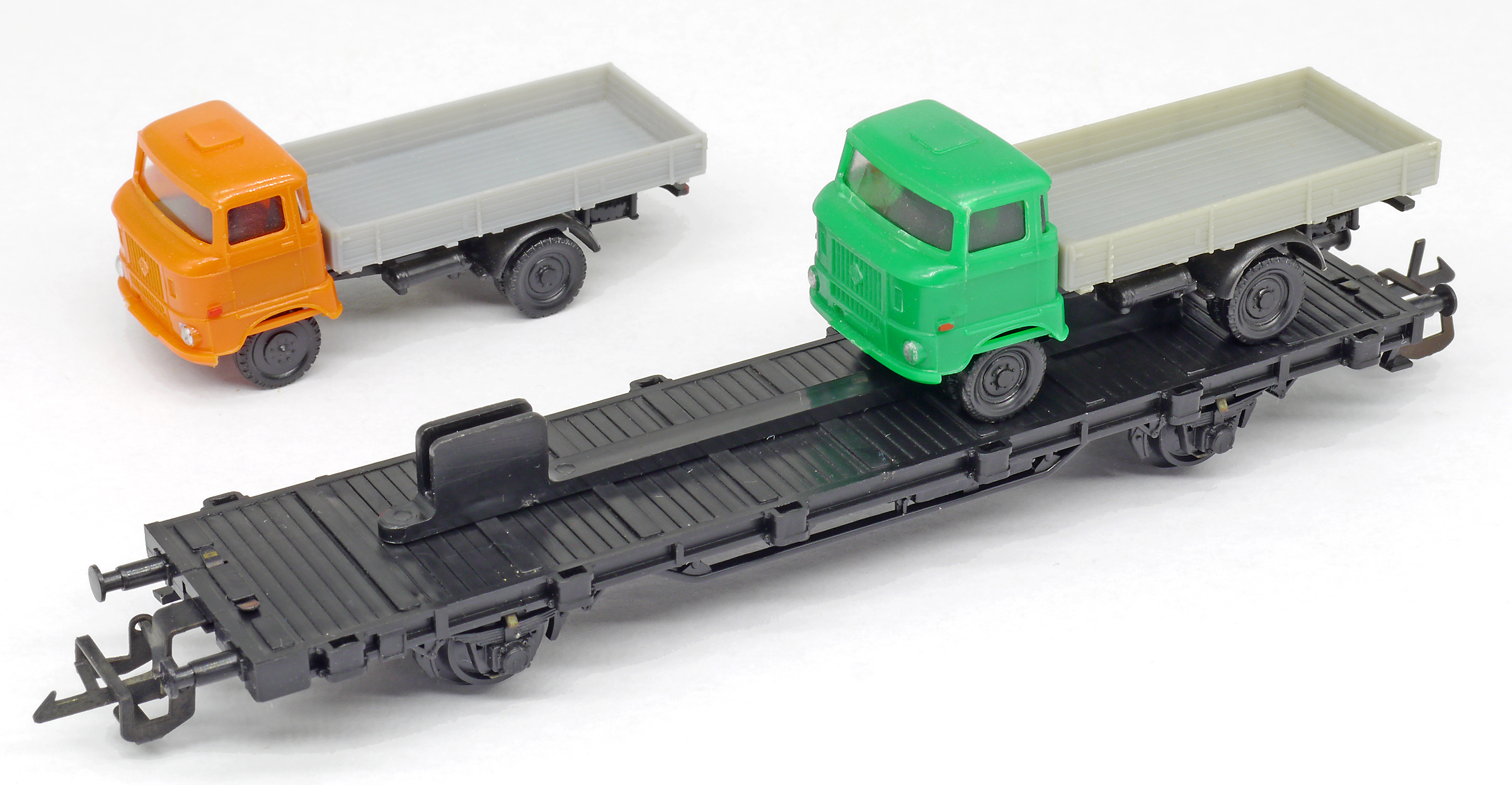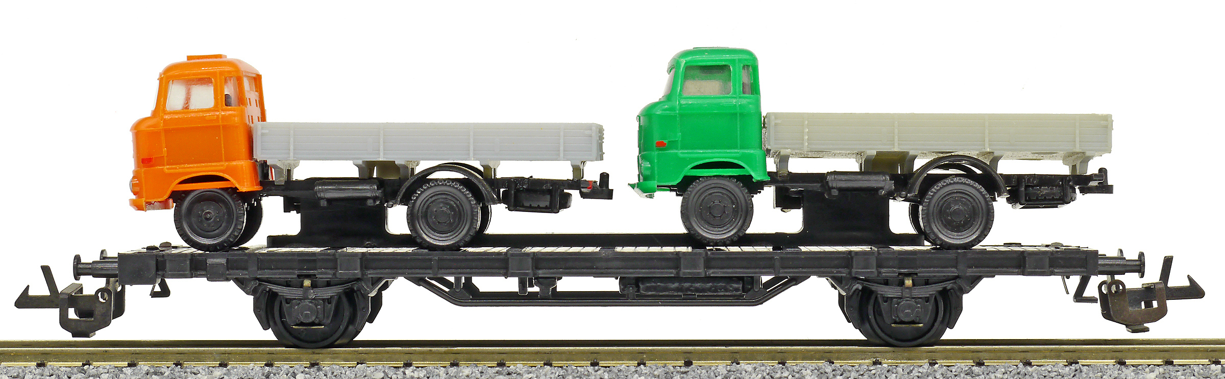 | nákladní plošinový vůz černý s nákladem dvou automobilů W50 |