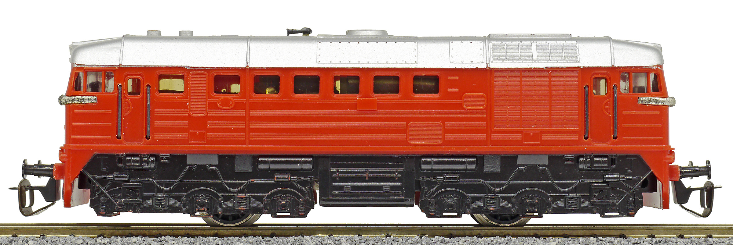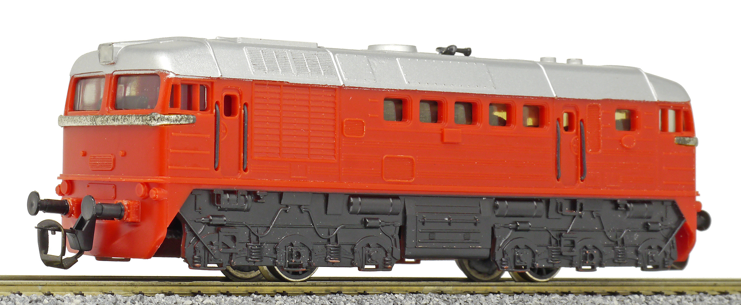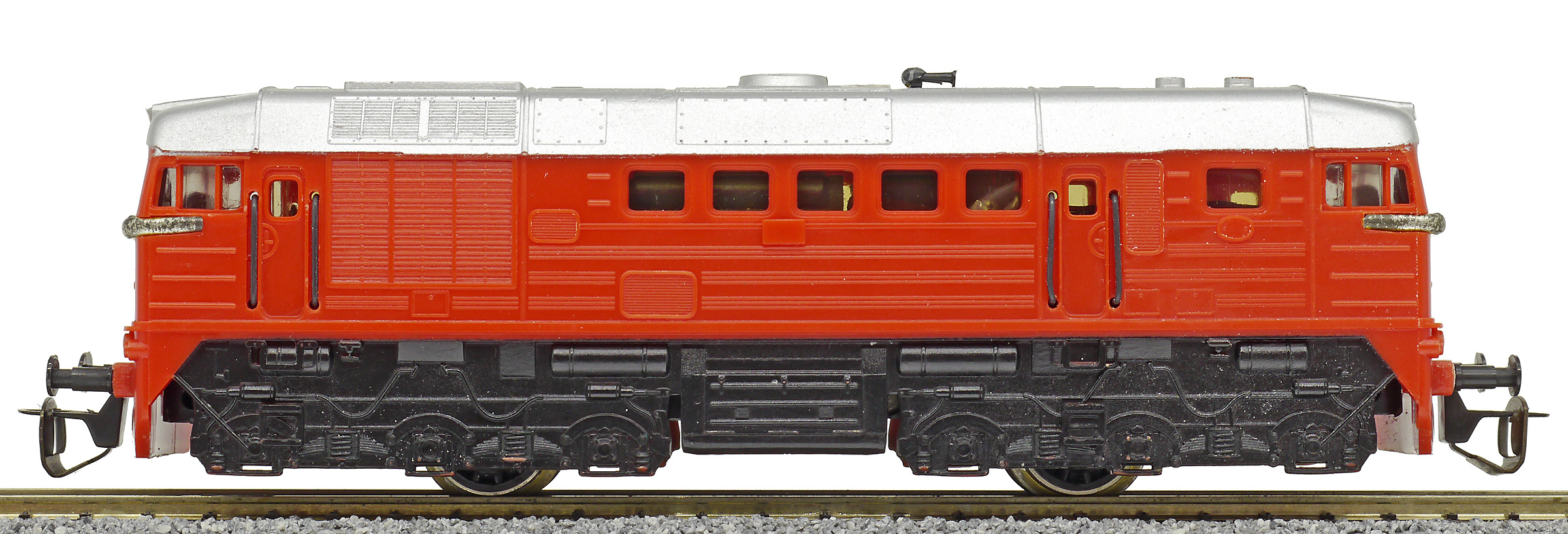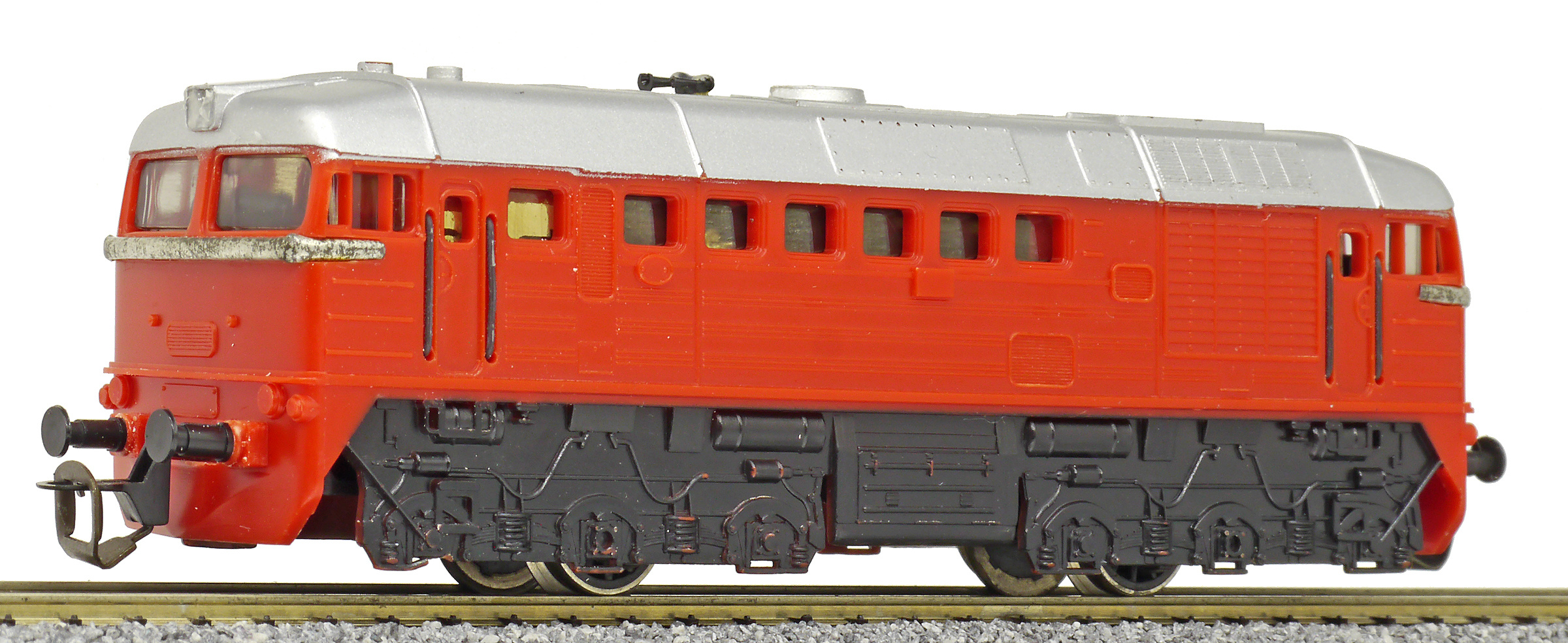 | dieselová lokomotiva červená v barvě plastu, stříbrná střecha a černá imitace pojezdu |