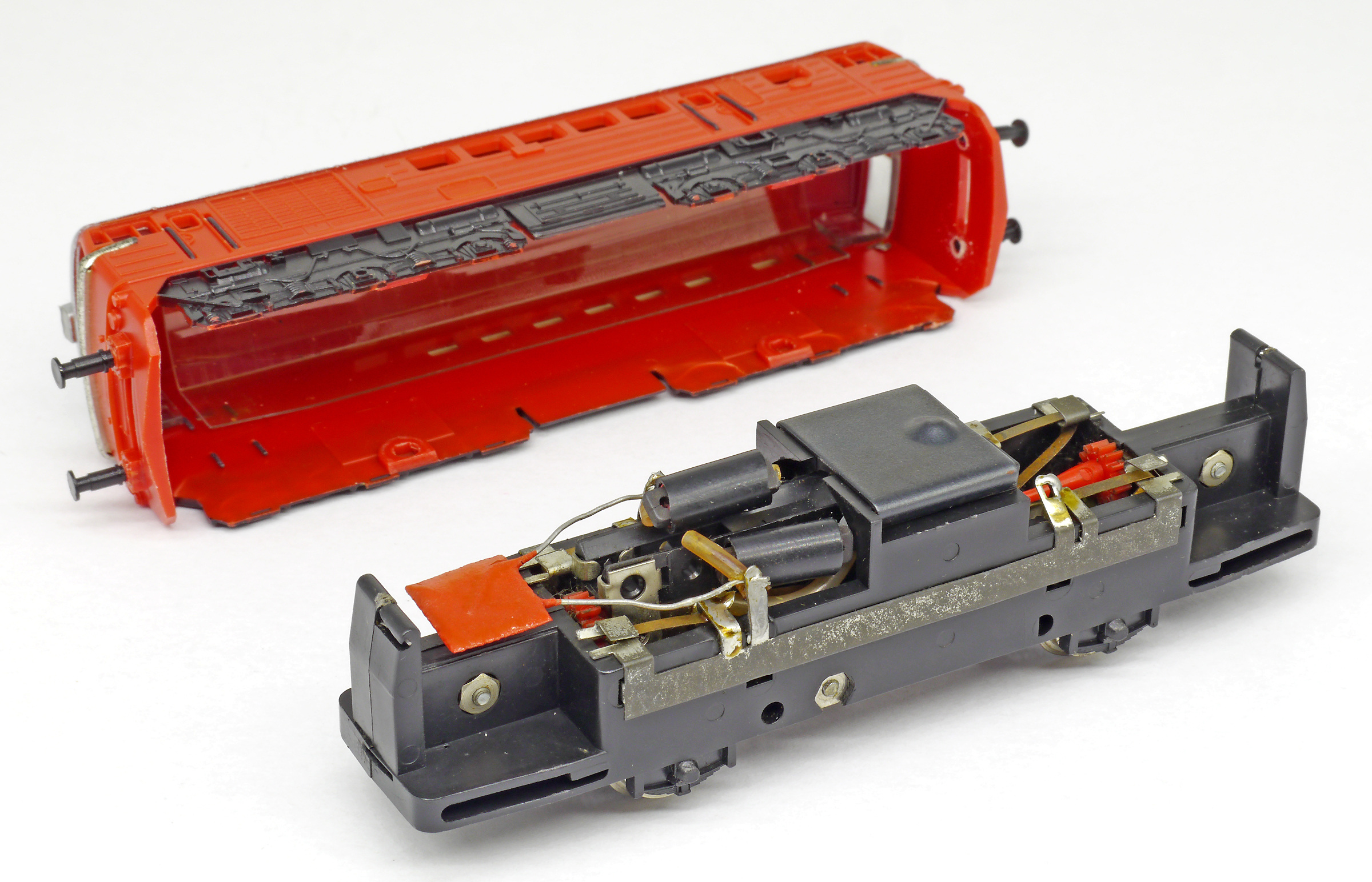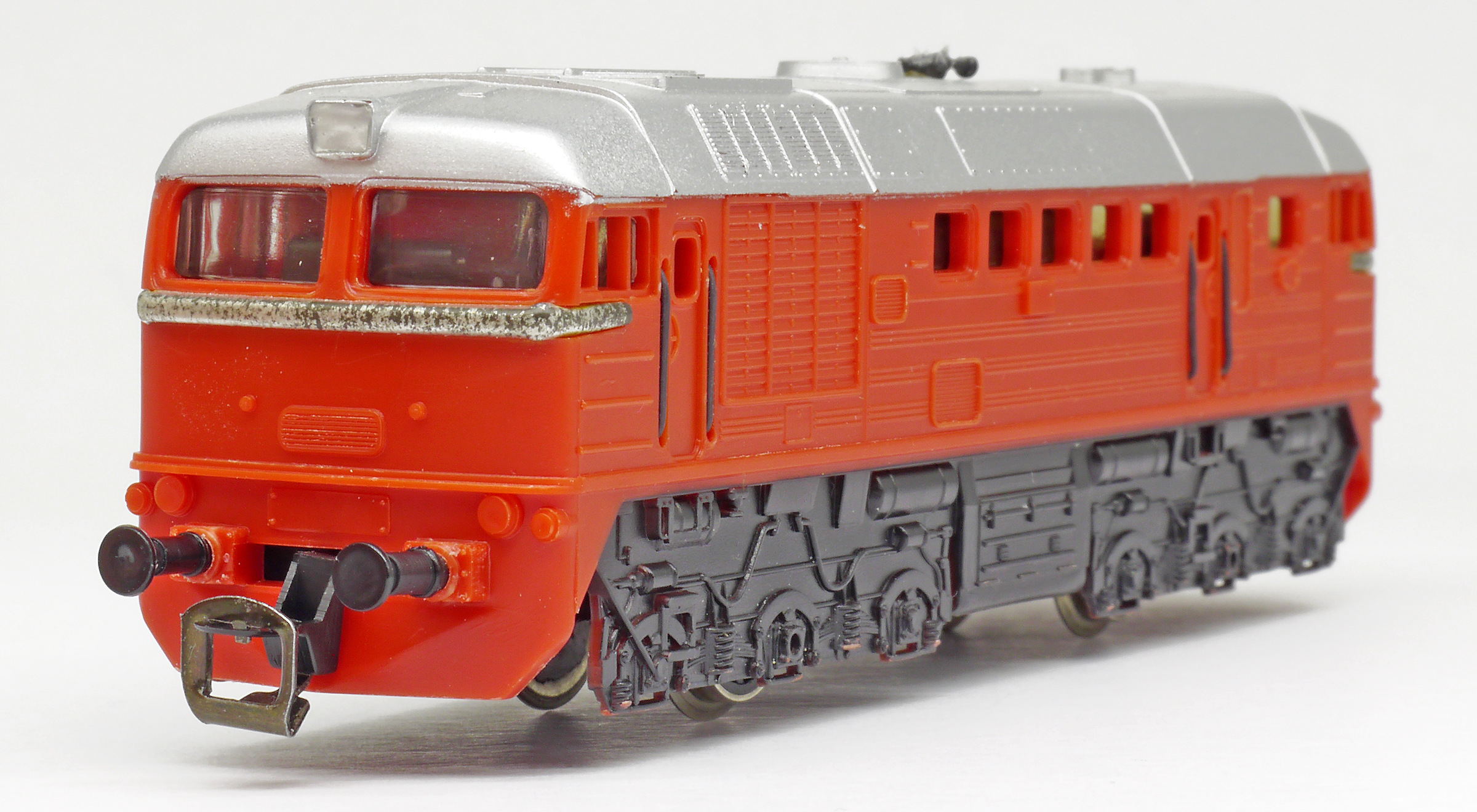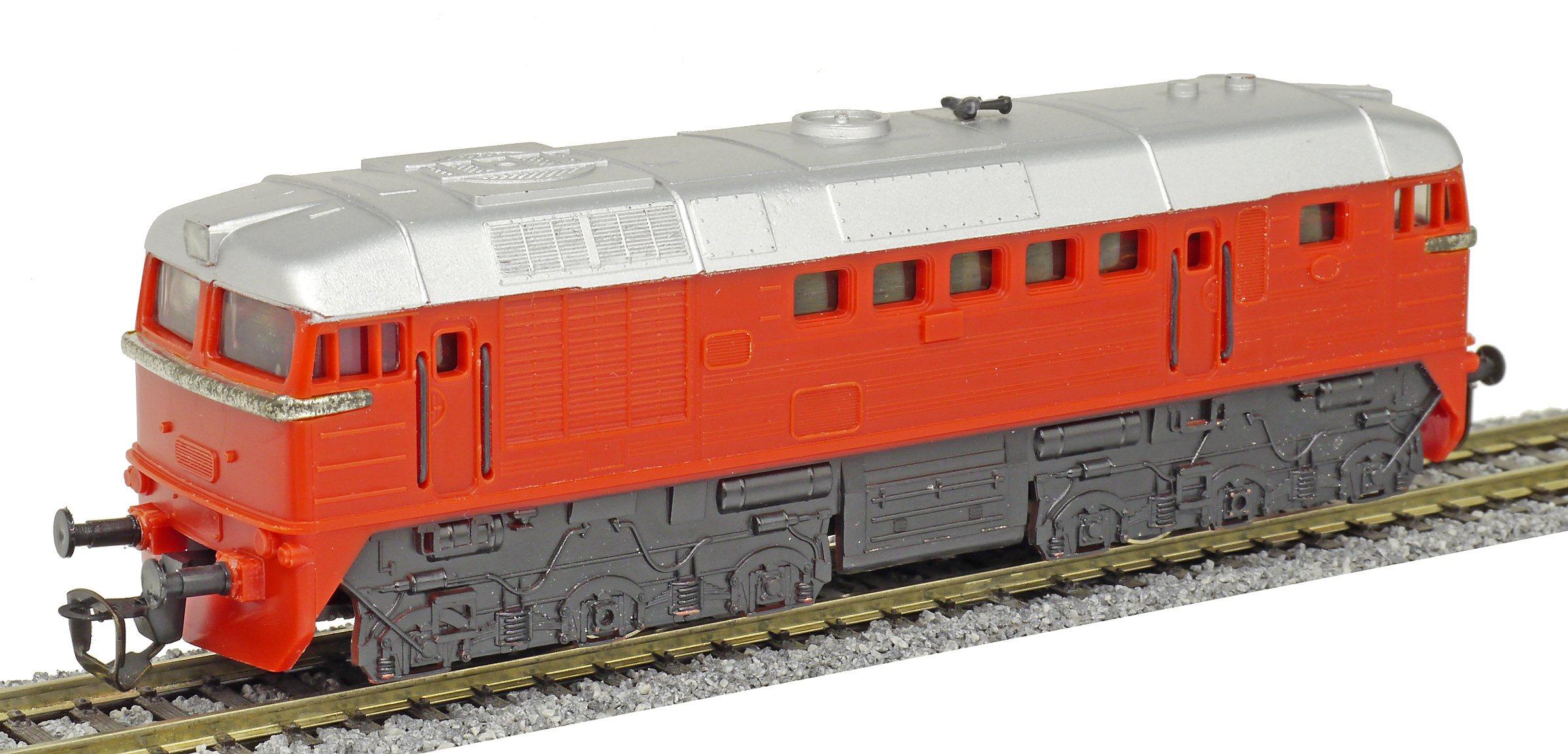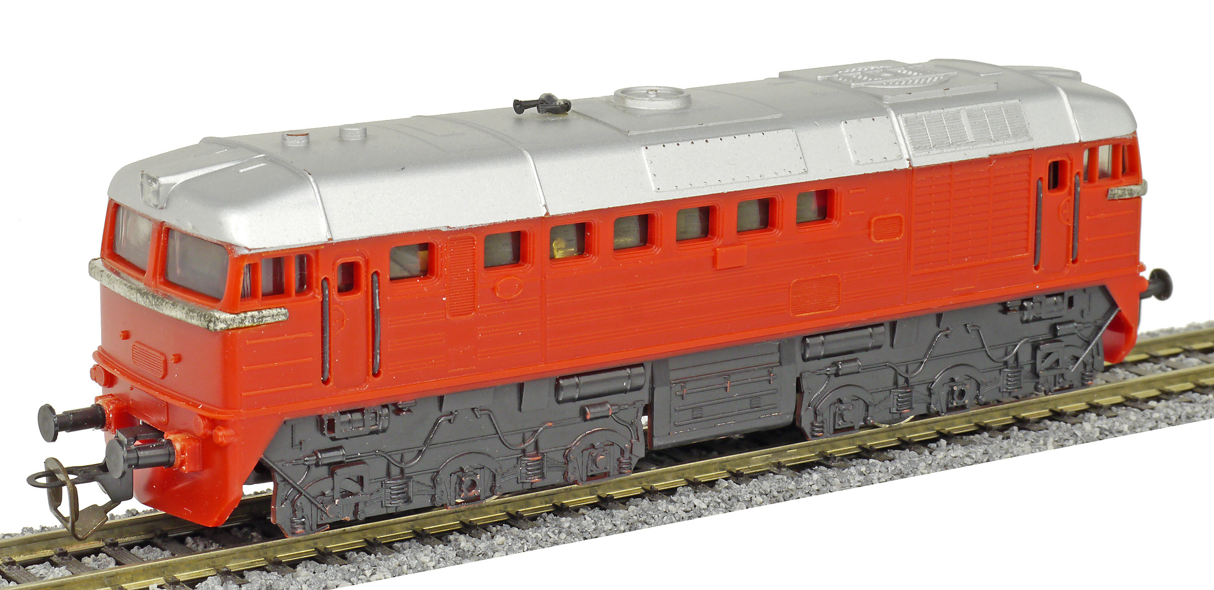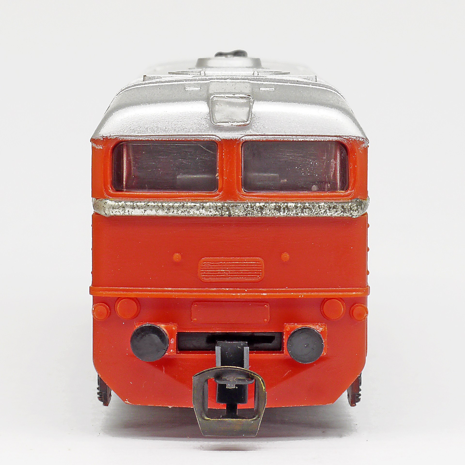 | dieselová lokomotiva červená v barvě plastu, stříbrná střecha a černá imitace pojezdu |