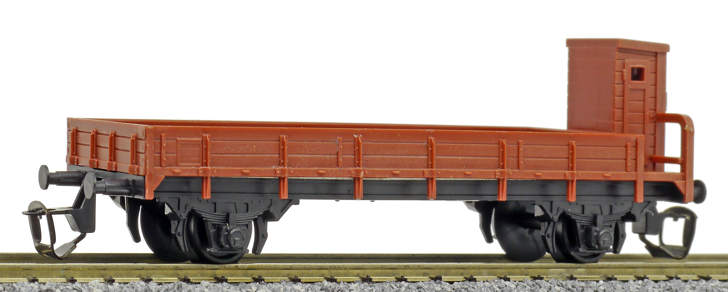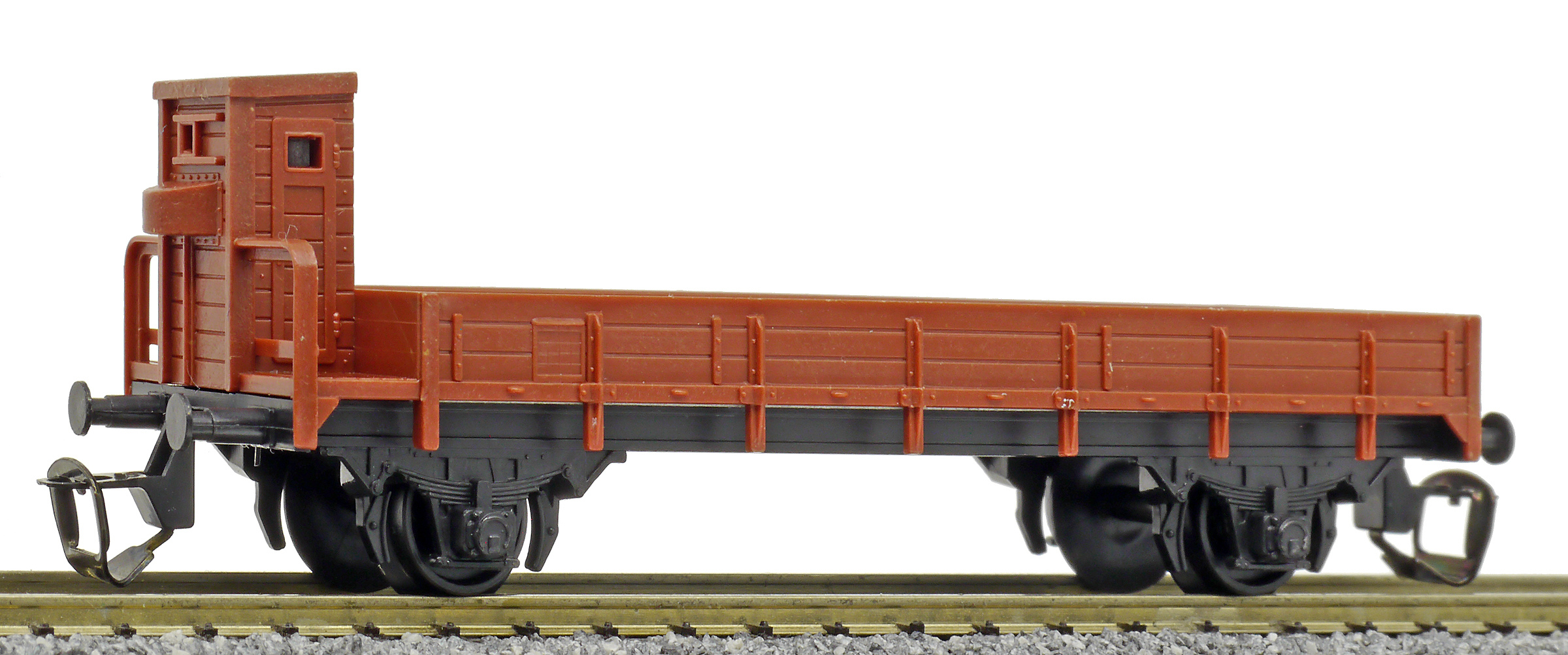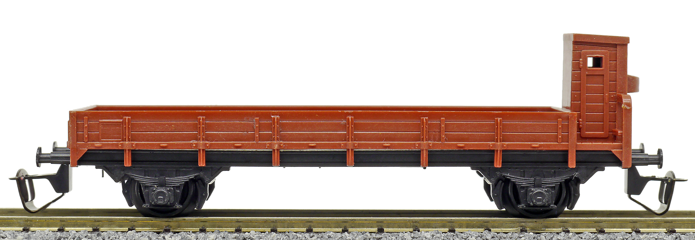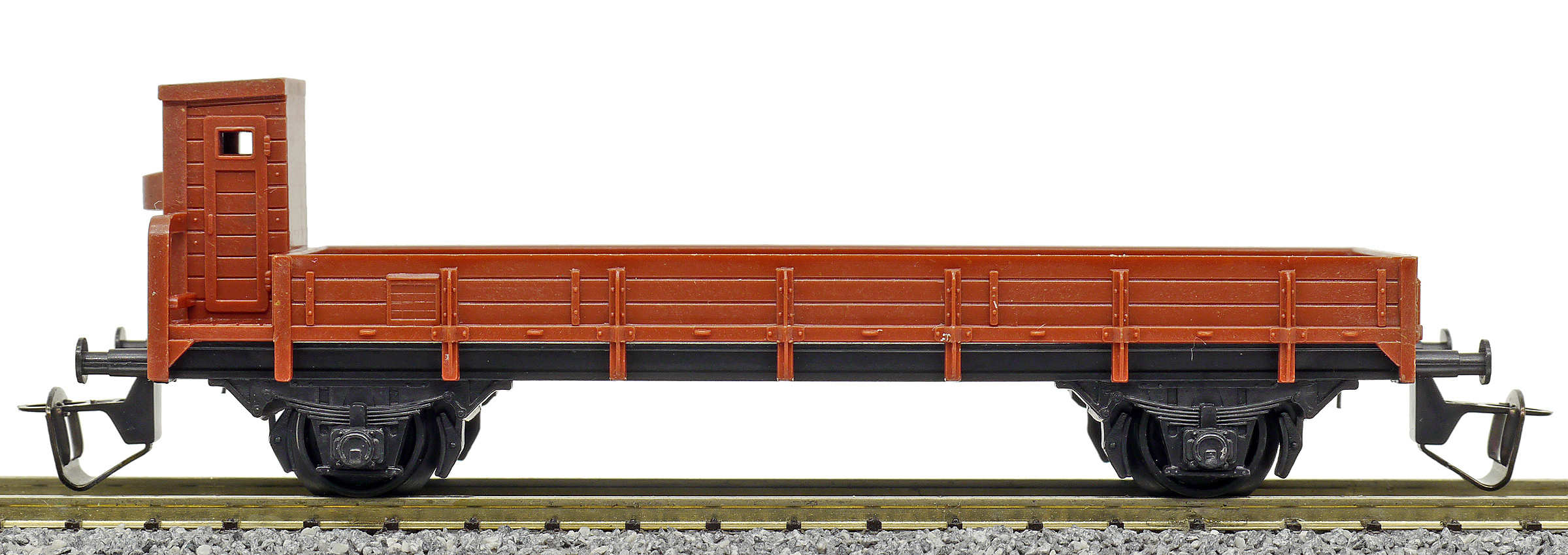 | nízkostěnný nákladní vůz červenohnědý s brzdařskou budkou |