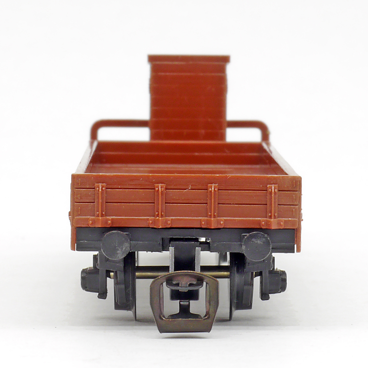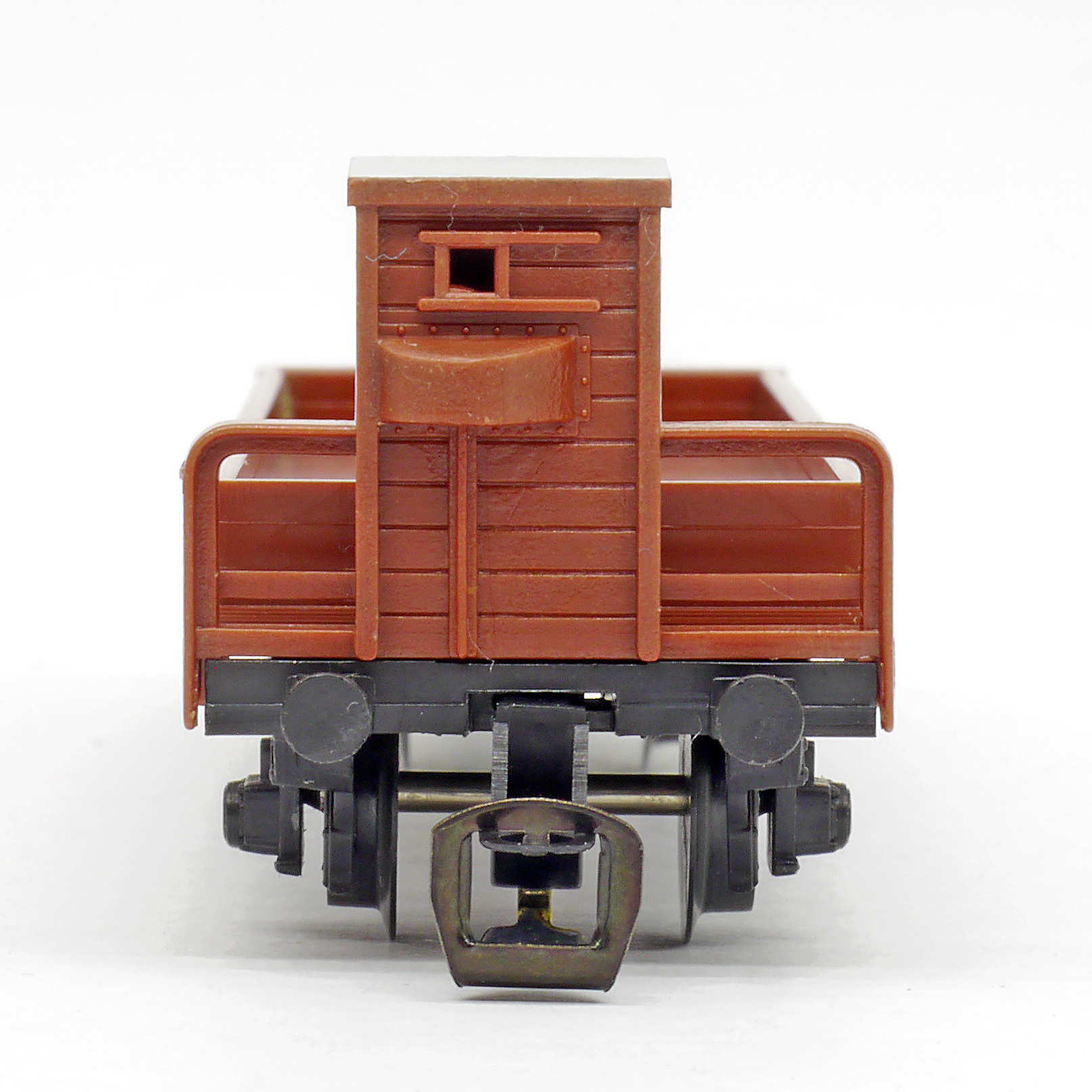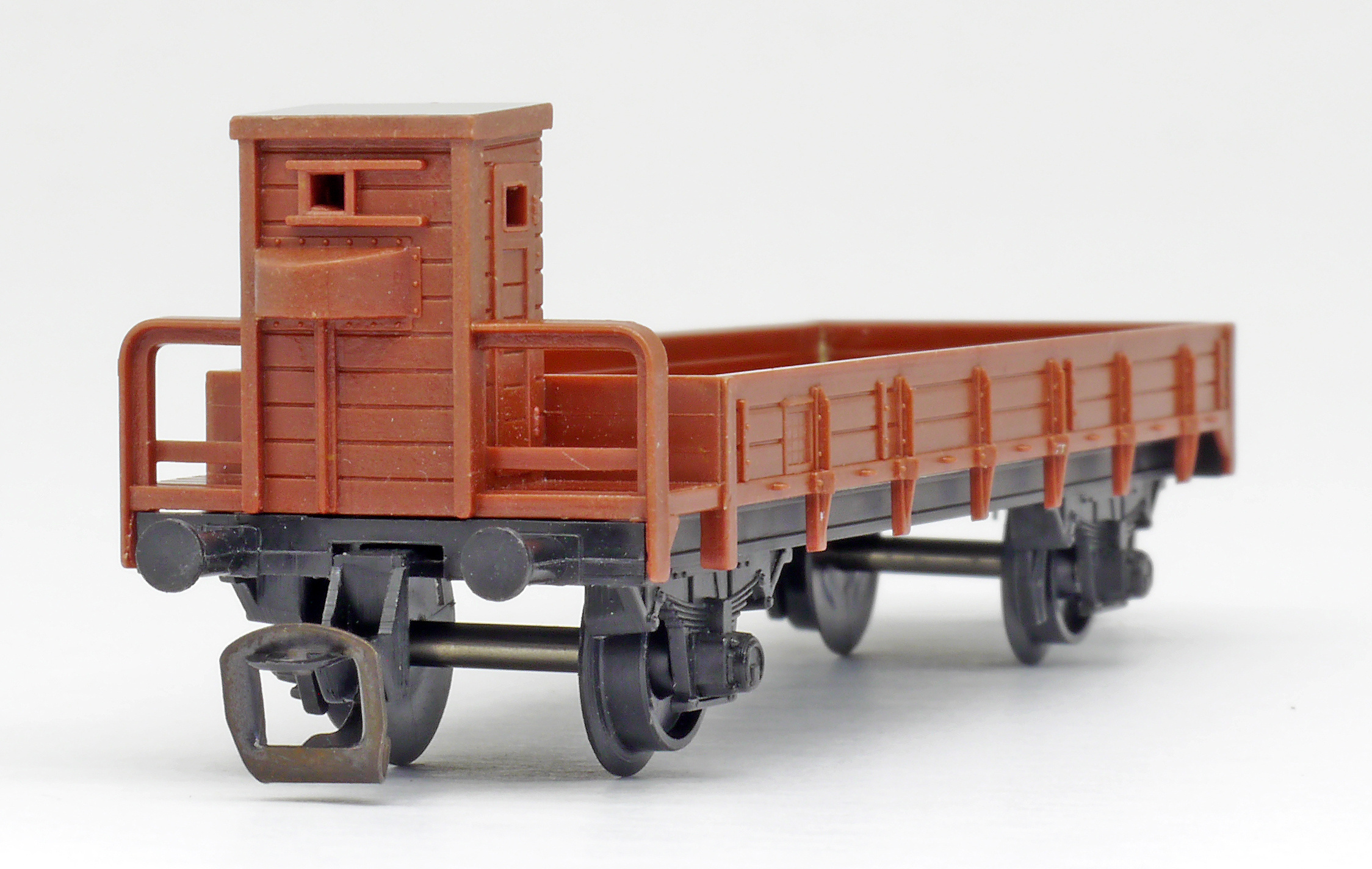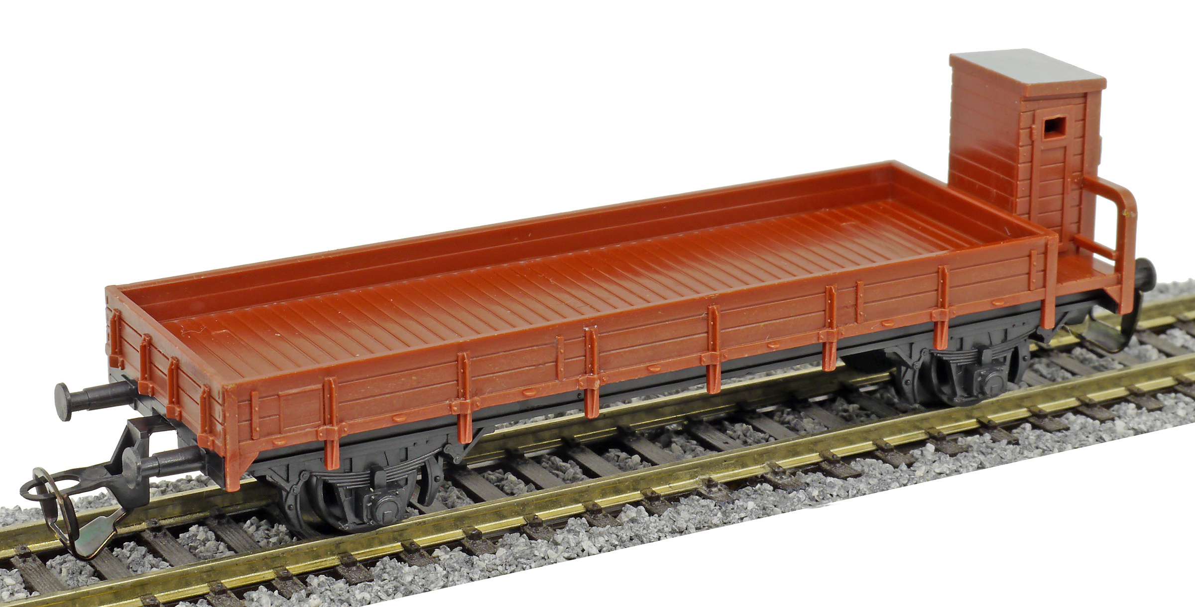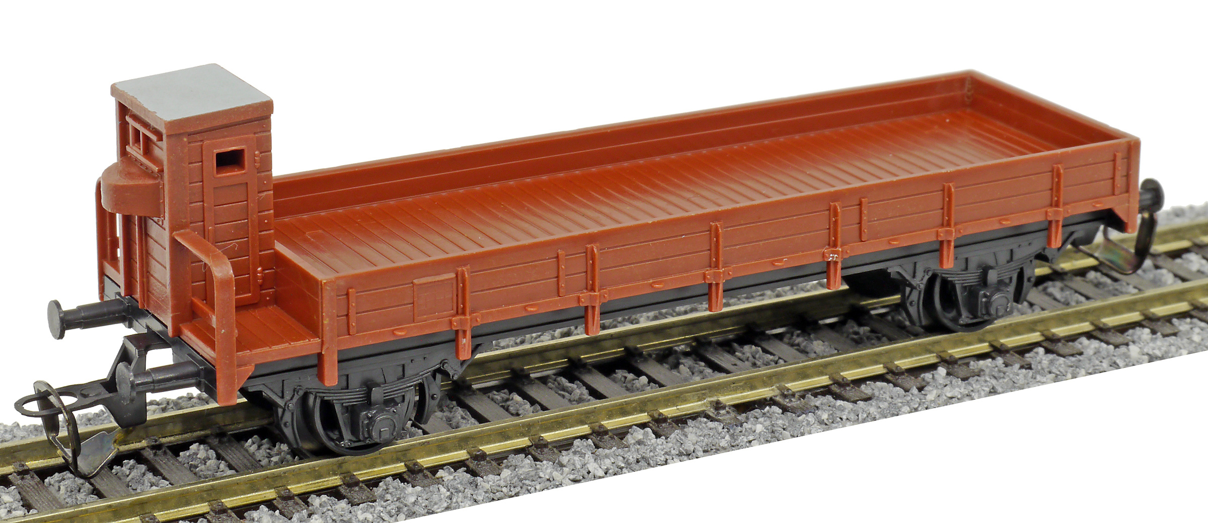 | nízkostěnný nákladní vůz červenohnědý s brzdařskou budkou |