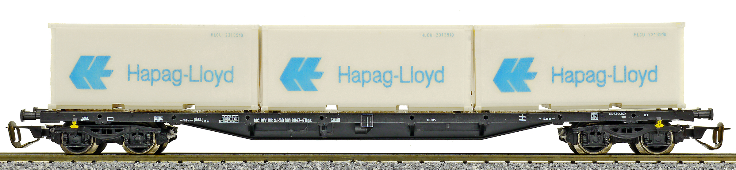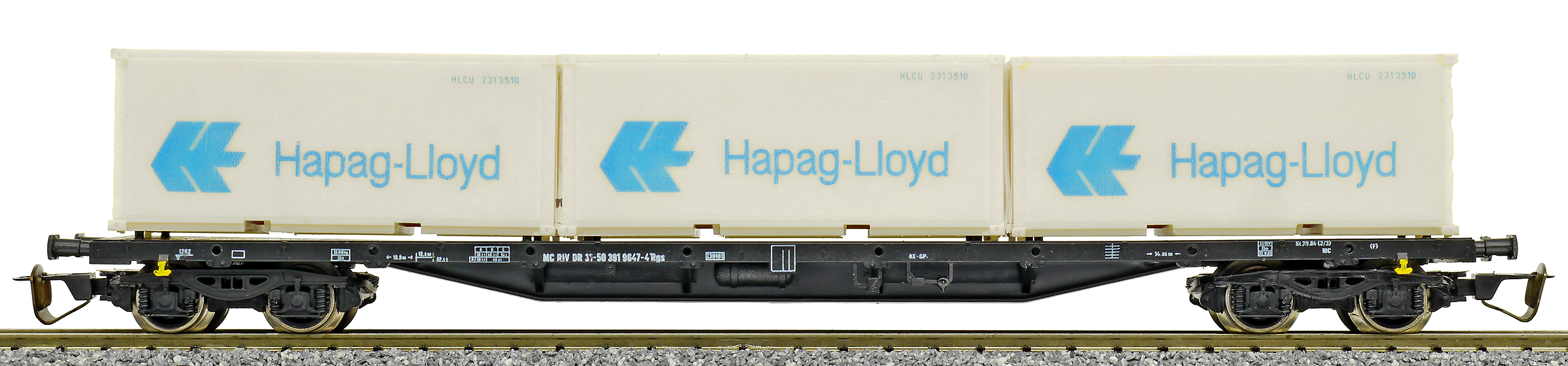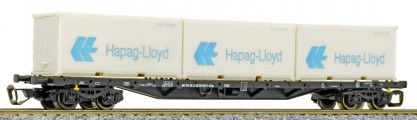 | nákladní plošinový vůz černý se třemi kontejnery 20' „Hapag-Lloyd“ |