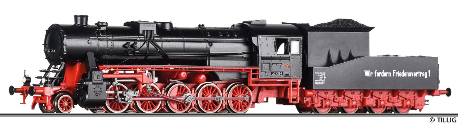 | parní lokomotiva černá s červeným pojezdem a s nápisem na tendru „Wir fordern Friedensvertrag“ |