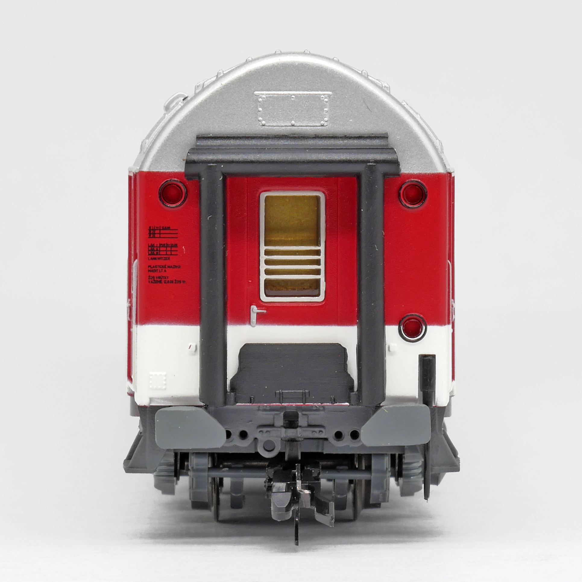| lůžkový vůz červený-bílý s stříbřitou střechou |