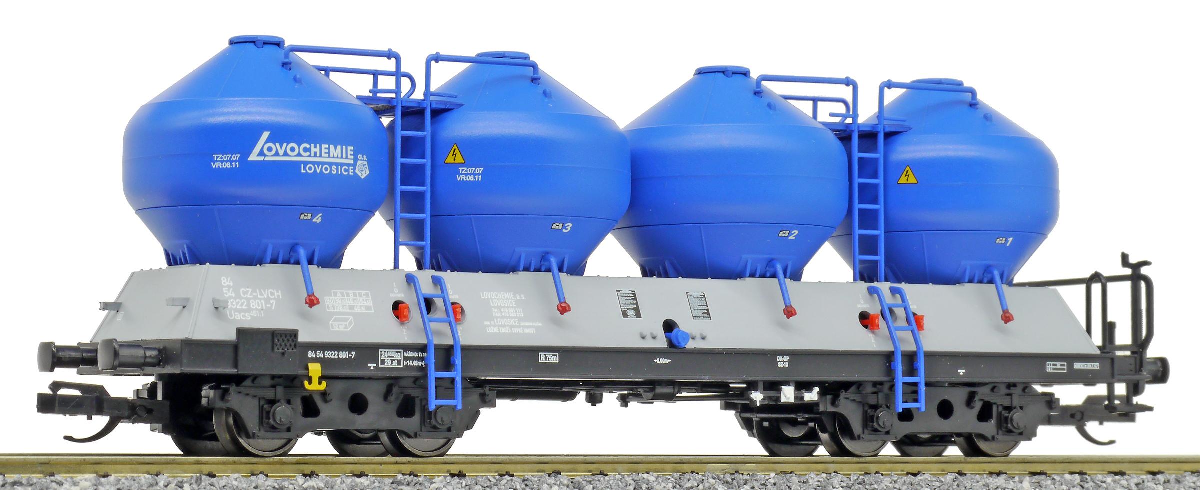 | nákladní samovýsypný vůz šedý s modrými nádobami a s logem „Lovochemie“ |