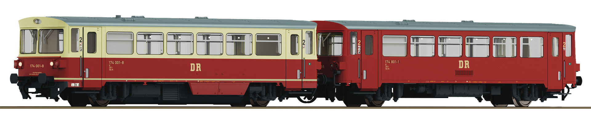 motorový vůz v barvě červený-slonová kost s šedou střechou s přípojným vozem v červené barvě s šedou střechou