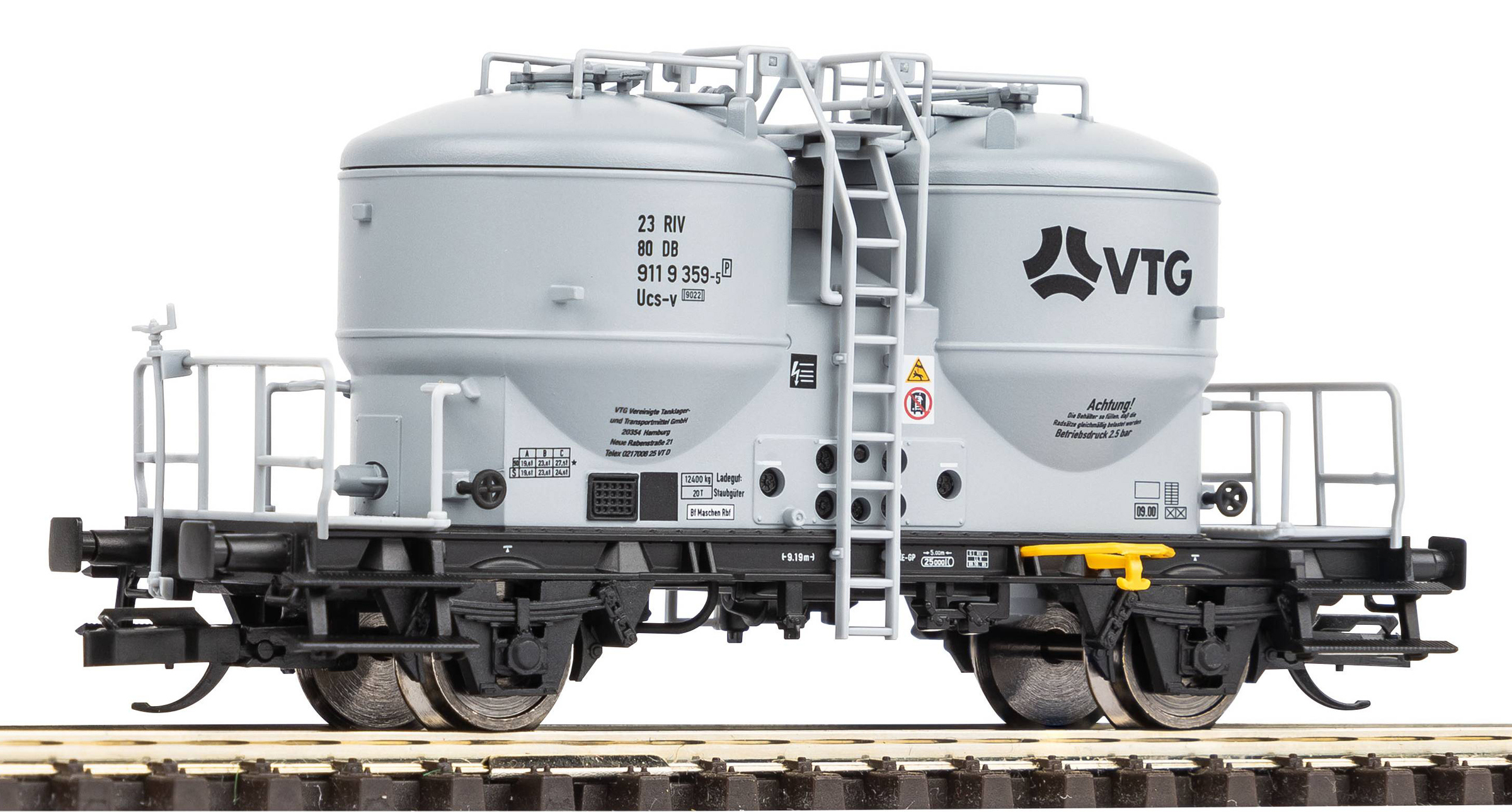| samovýsypný šedý nádobový vůz na cement s logem „VTG“ |