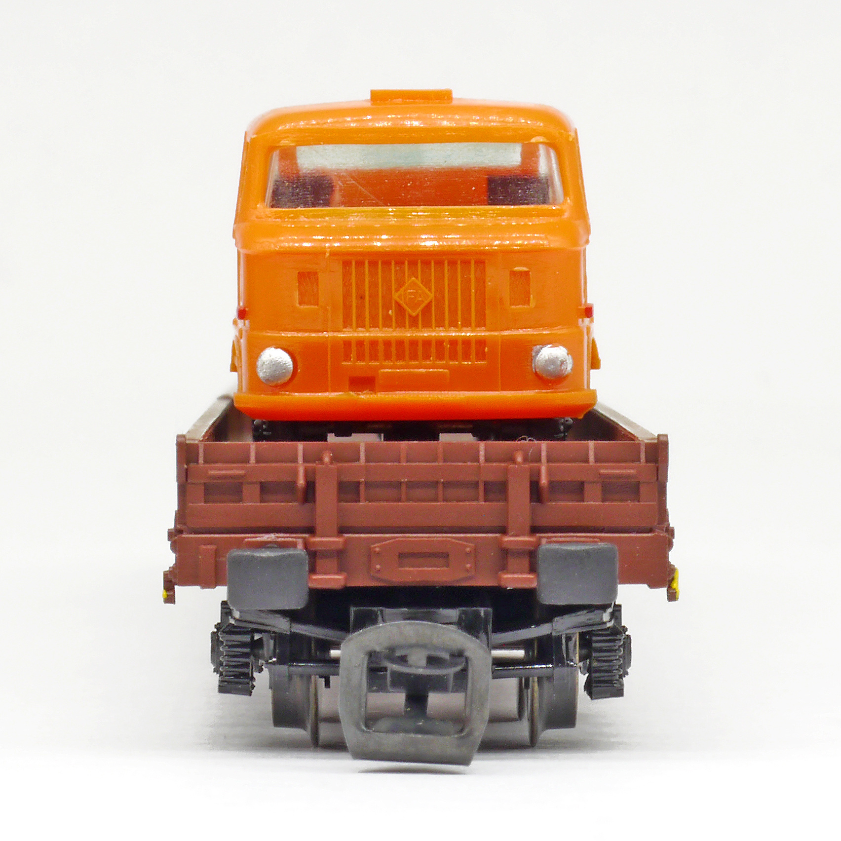 | nízkostěnný nákladní vůz červenohnědý ložený dvěma nákladními auty IFA |