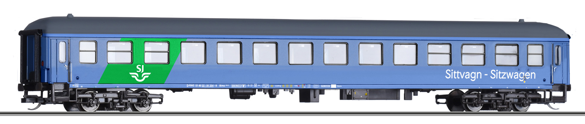 | rychlíkový vůz modrý s šedou střechou |