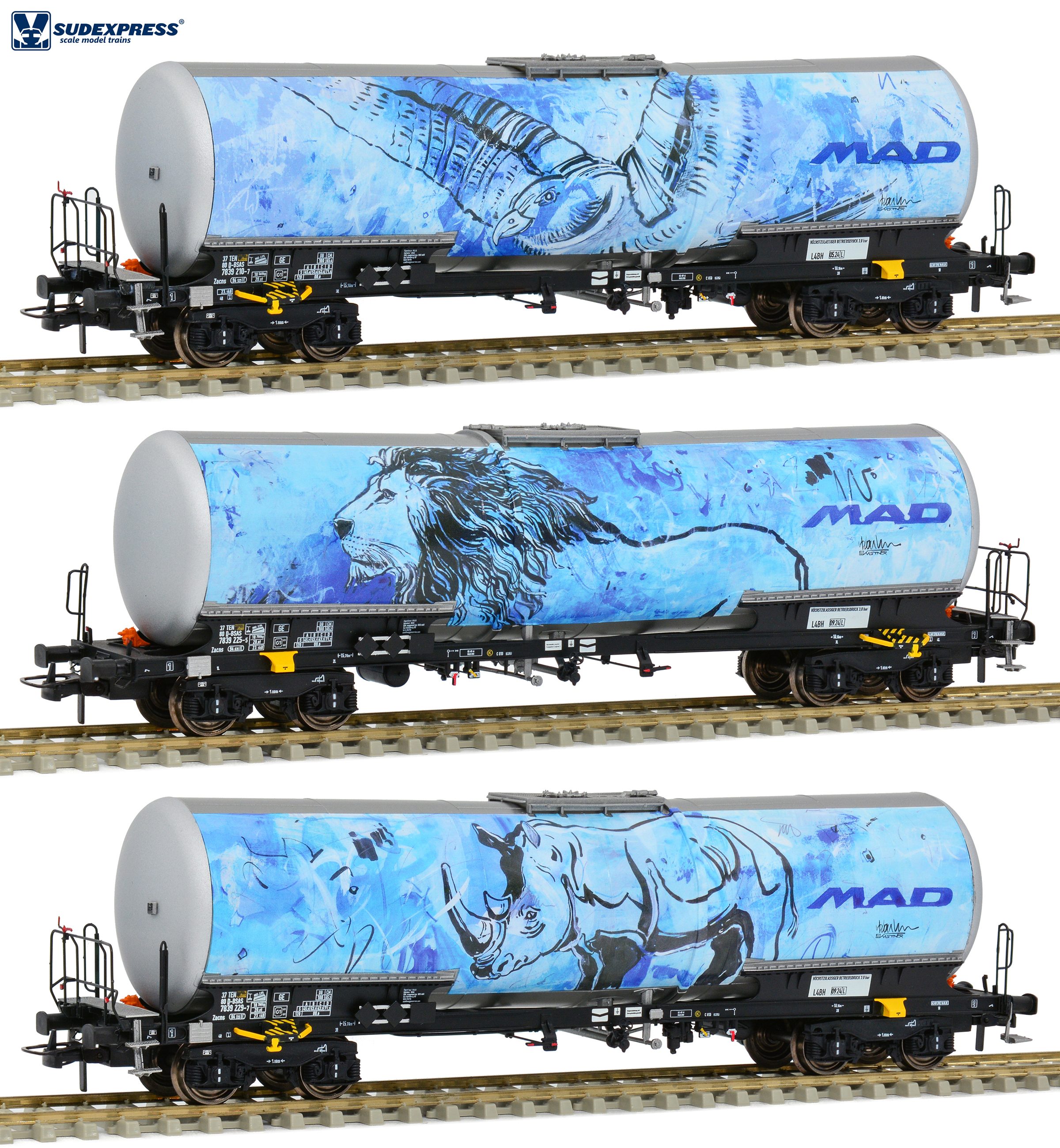 set tří šedých kotlových vozů s potiskem motivů zvířat