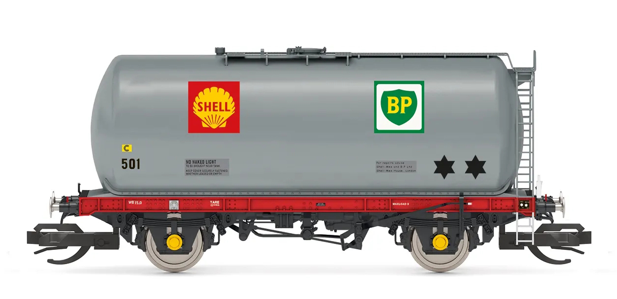| kotlový vůz šedý s logy „SHELL“ a „BP“ |