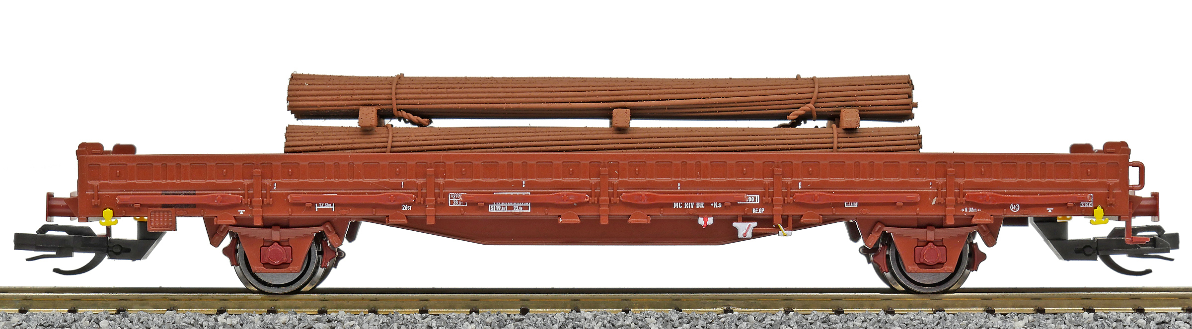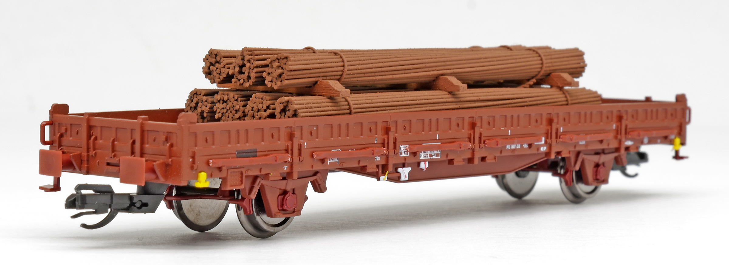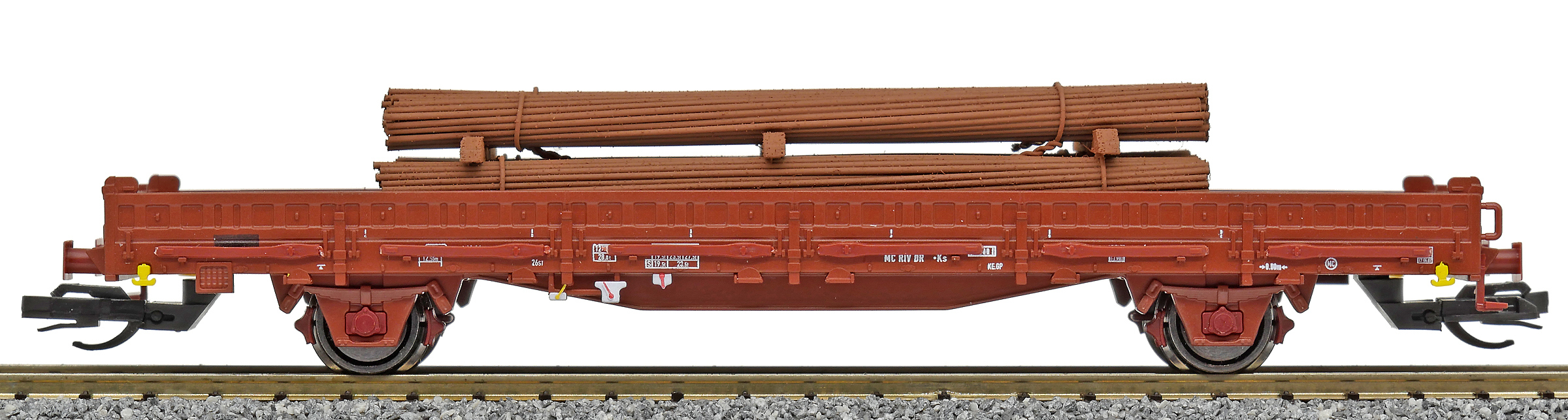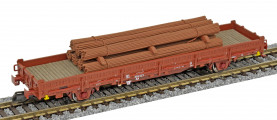 | nízkostěnný nákladní vůz červenohnědý s klanicemi s nákladem ocelových svazků |