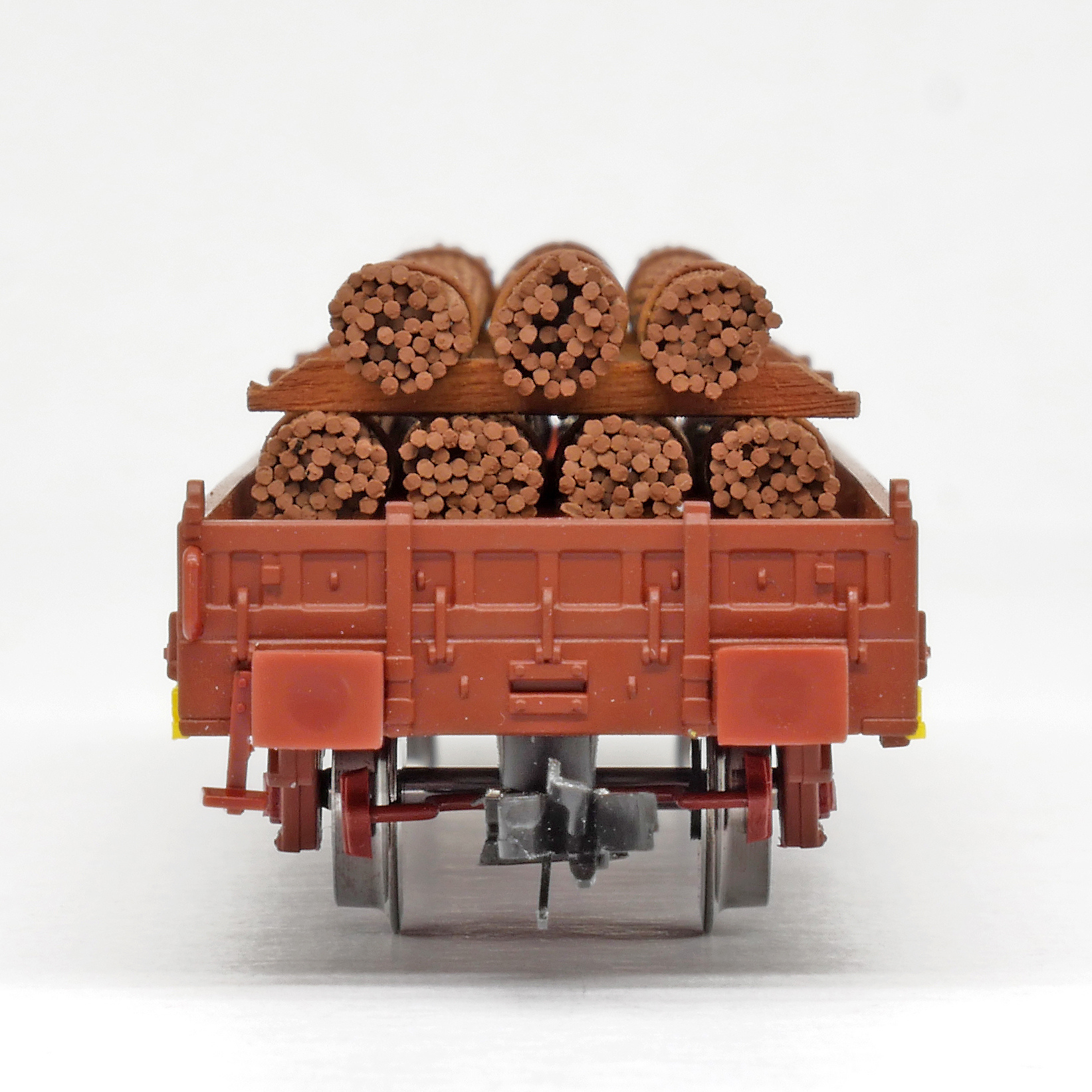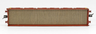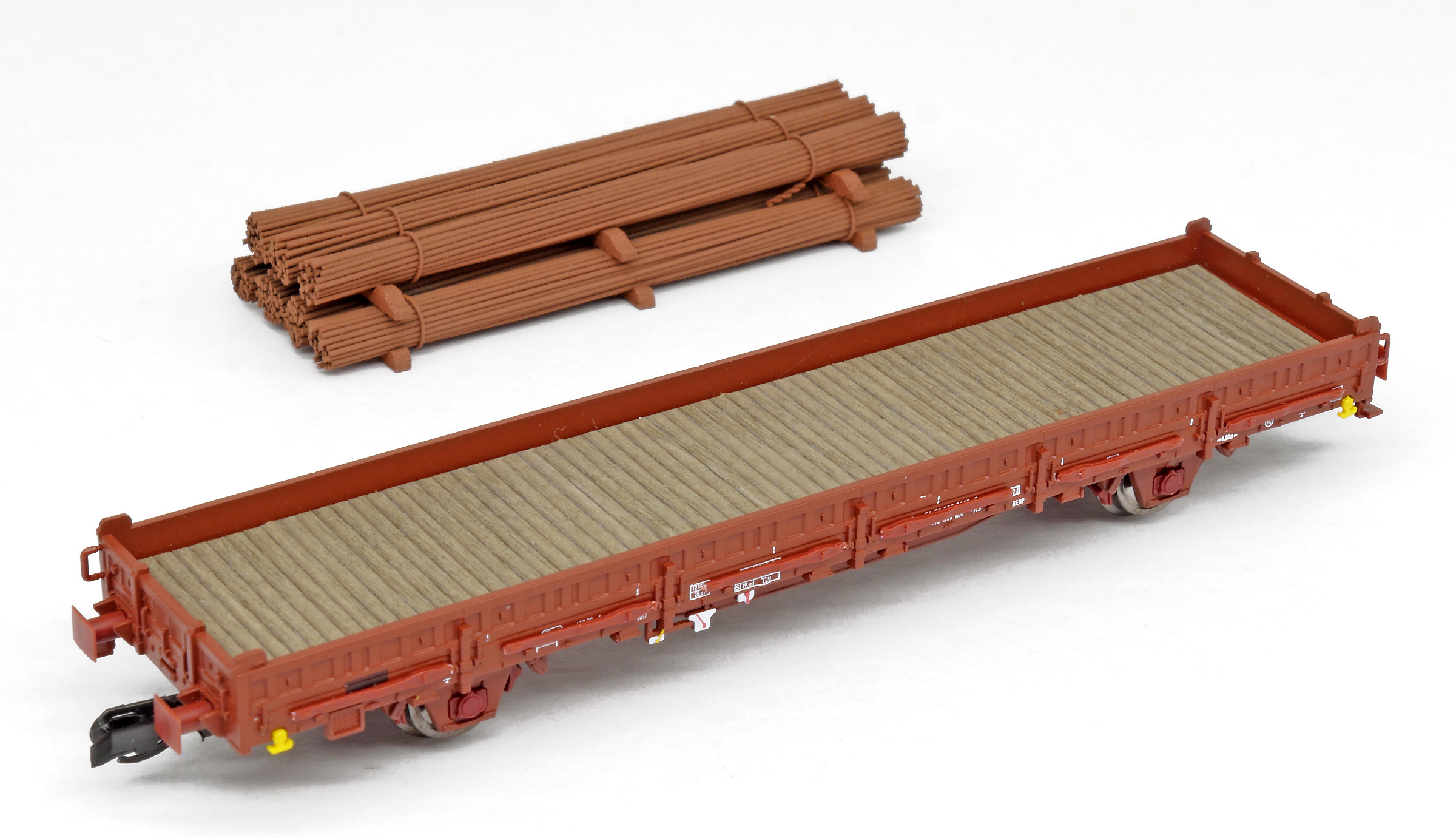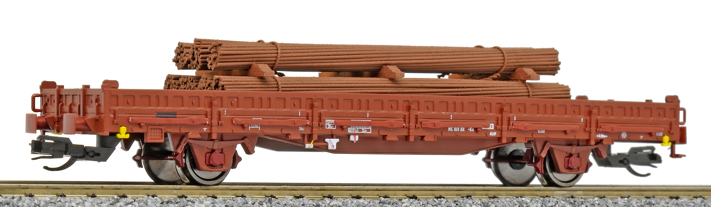| nízkostěnný nákladní vůz červenohnědý s klanicemi s nákladem ocelových svazků |