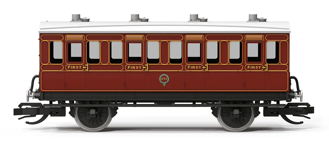 | osobní vůz tmavě červený se světle šedou střechou „First Class Coach“ |