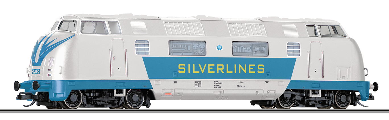 | dieselová lokomotiva v barevném schematu „SILVERLINES“ |