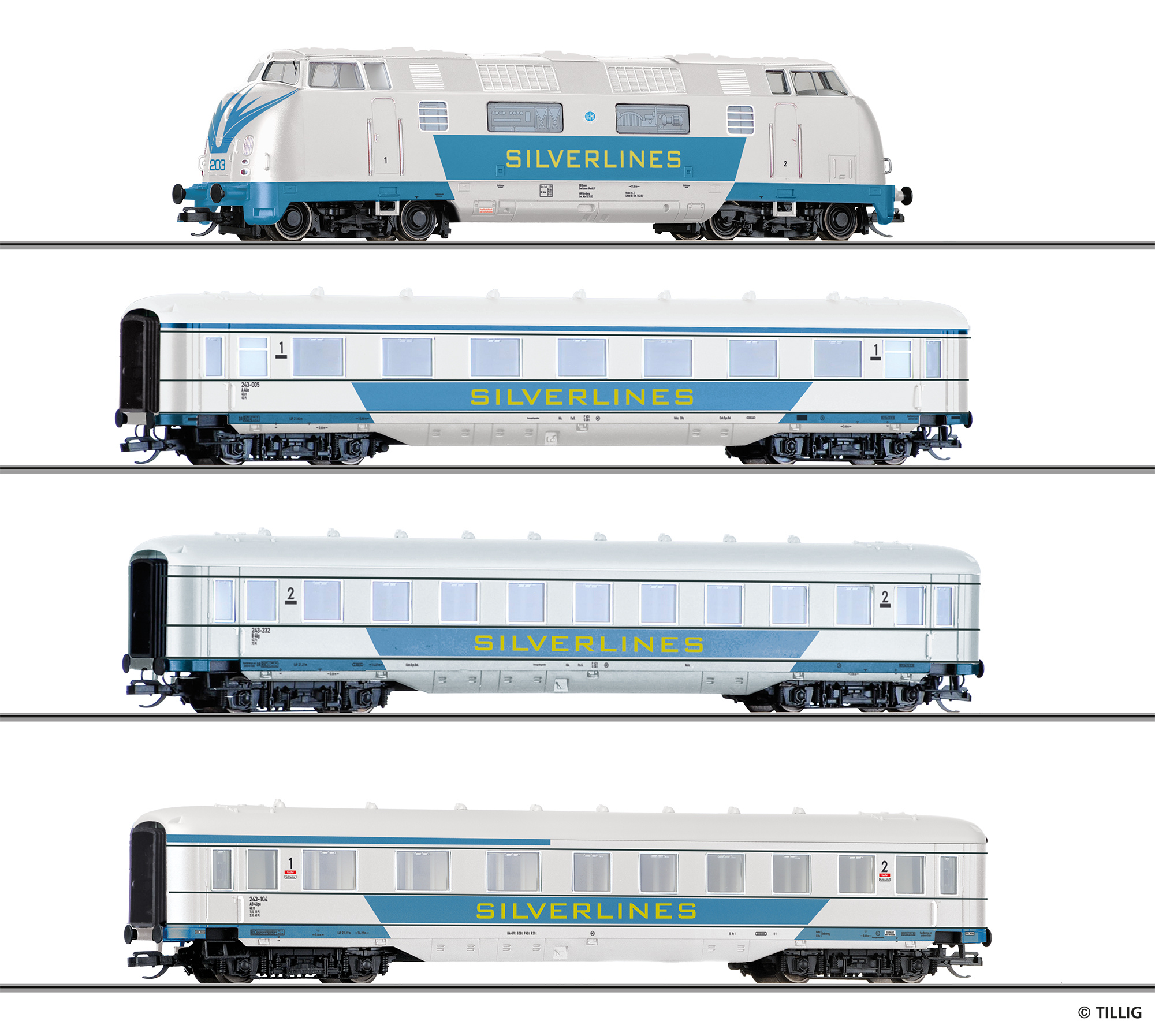 | set dieselové lokomotivy V200 a tří rychlíkových vozů „SILVERLINES“ |