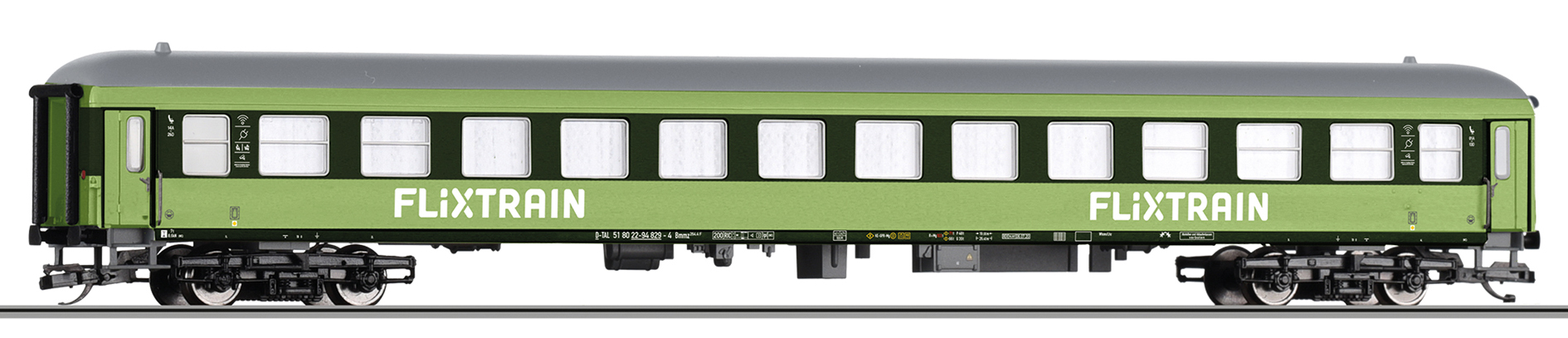 | rychlíkový vůz v barevném schematu „Flixtrain“ |