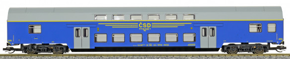 | středový patrový vůz v barvě modré, šedá střecha a dveře |