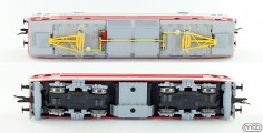 | elektrická lokomotiva červená-bílá, šedá střecha, rám a pojezd |