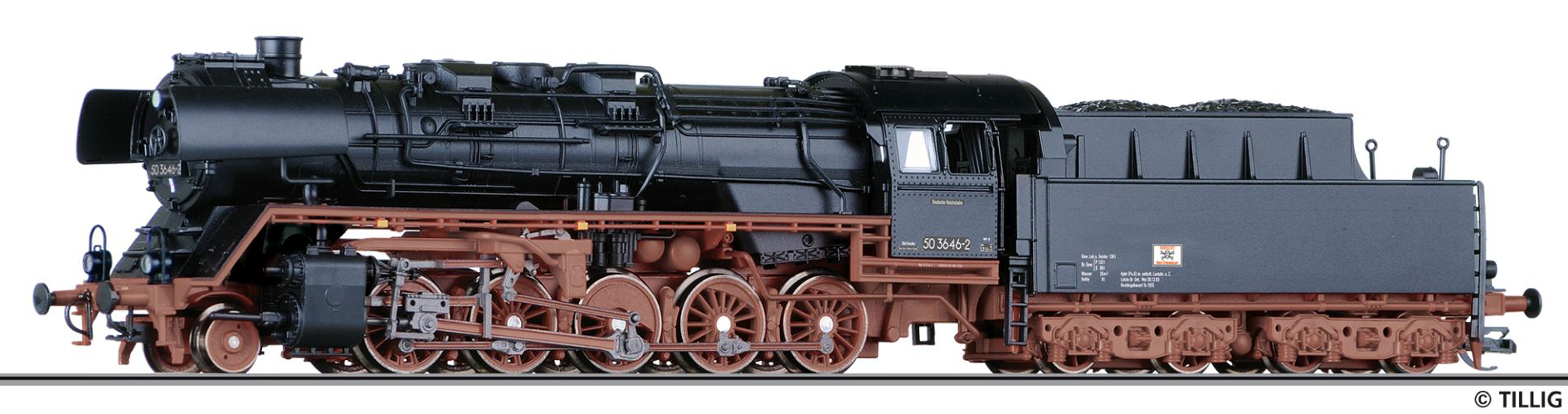 | parní lokomotiva černá s kouřovými plechy a s hnědým pojezdem, reko, tendr T26 (z BR 50 3604-1) |