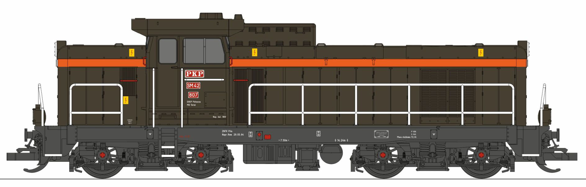Popis   dieselová lokomotiva tmavě hnědá s oranžovým proužkem, černý rám a pojezd