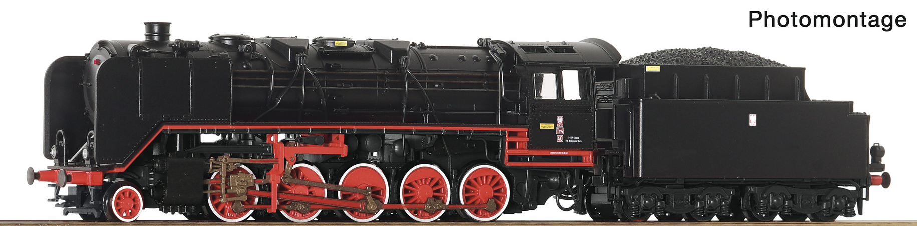 | parní lokomotiva černá s kouřovými plechy, červená kola s bílým lemováním |