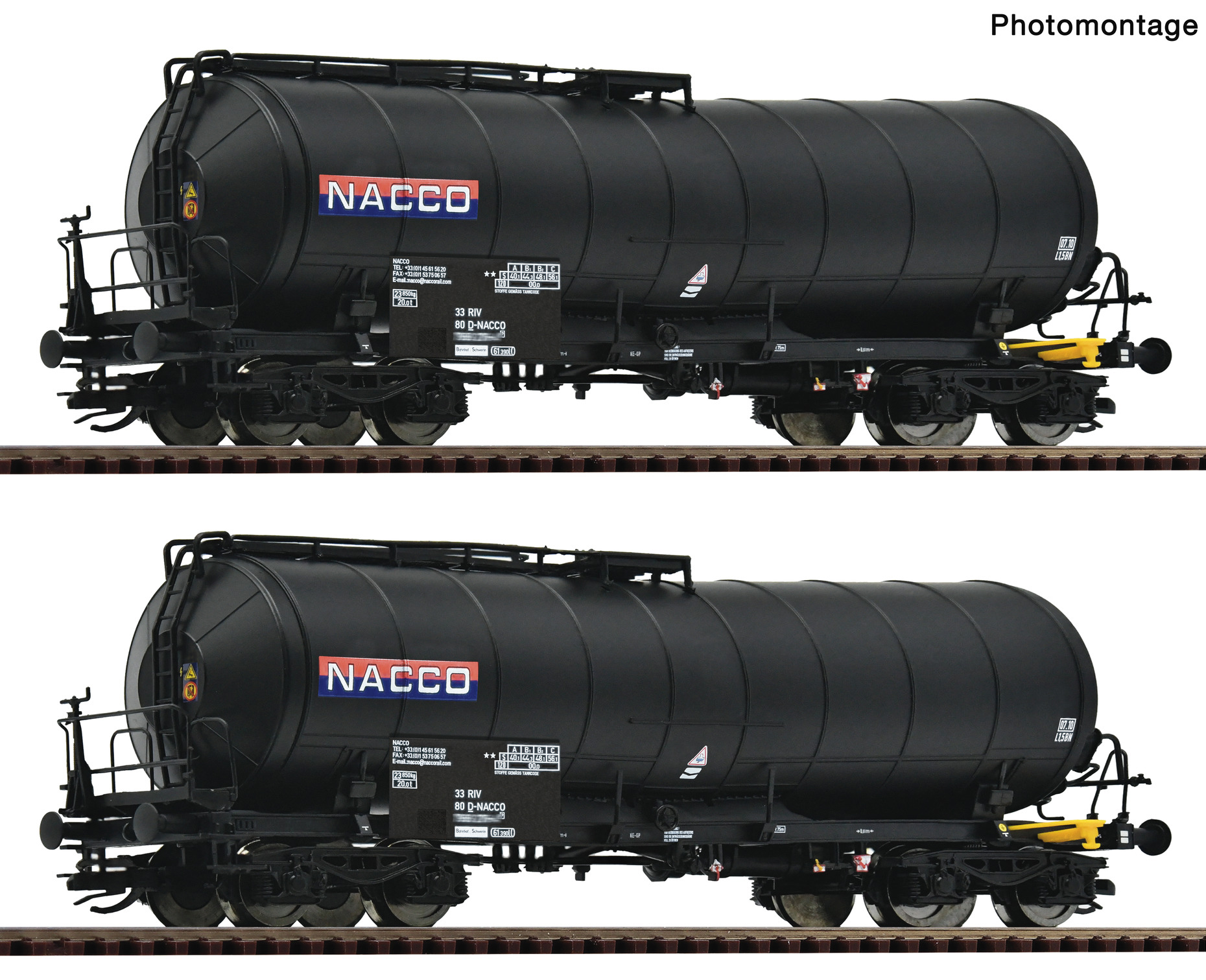 | set dvou černých kotlových vozů s logem „NACCO“ |