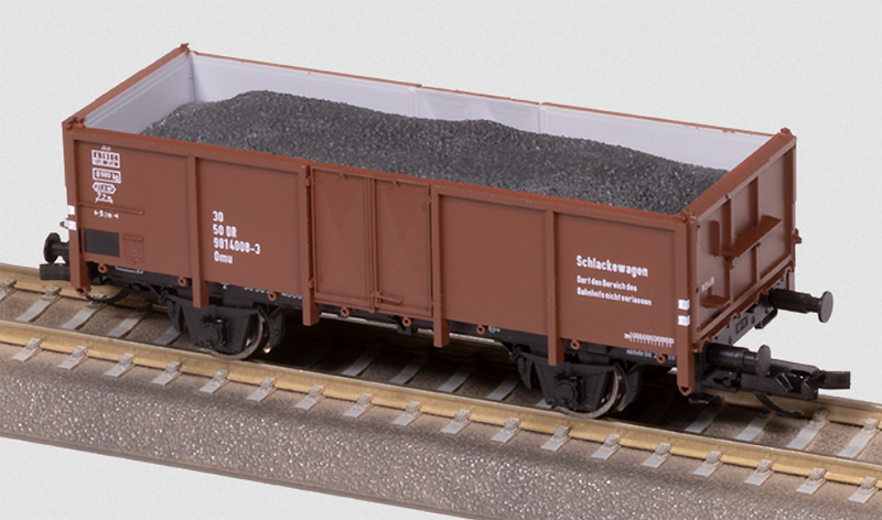 | otevřený nákladní vůz červenohnědý na přepravu strusky s nákladem |