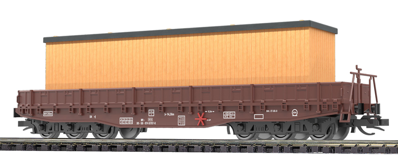 | nízkostěnný nákladní vůz červenohnědý s přepravní bednou pro zámořskou přepravu |