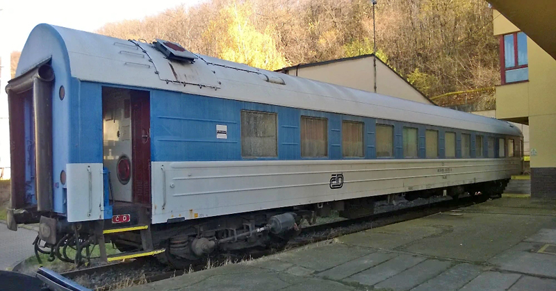 | lůžkový vůz modrý-bílý s šedou střechou, bočnice s prolisy |