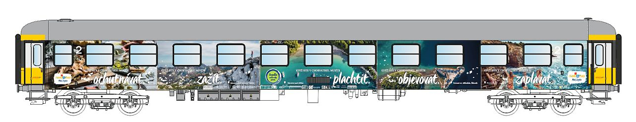 | rychlíkový vůz v barevném schematu „RegioJet “ s reklamním potiskem „Chorvatsko“ 2. tř. |