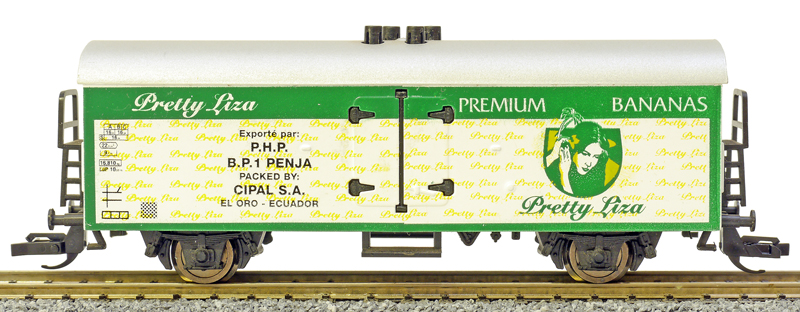nákladní chladící vůz se stříbrnou střechou s reklamním potiskem „Pretty Liza PREMIUM BANANAS“