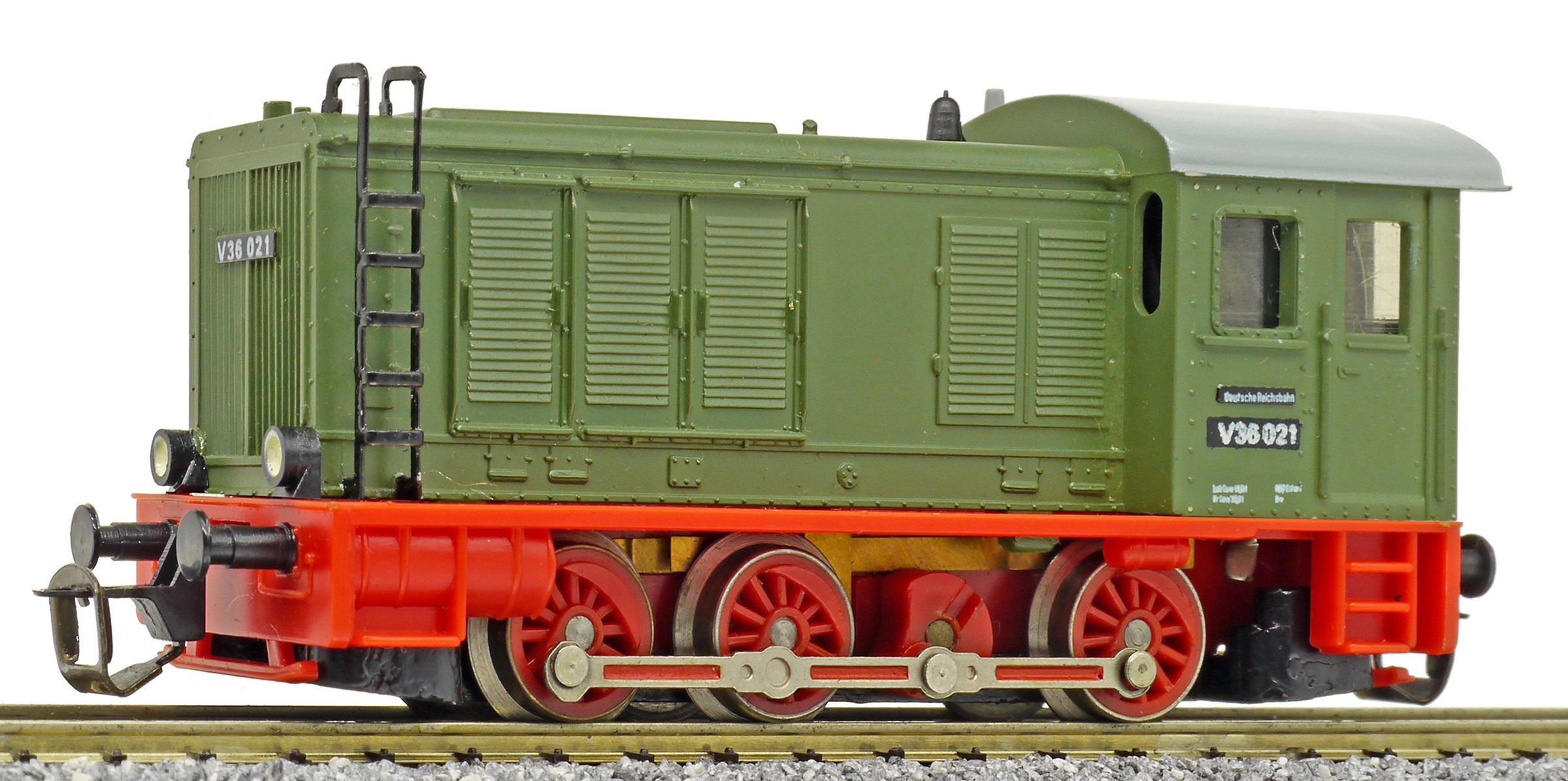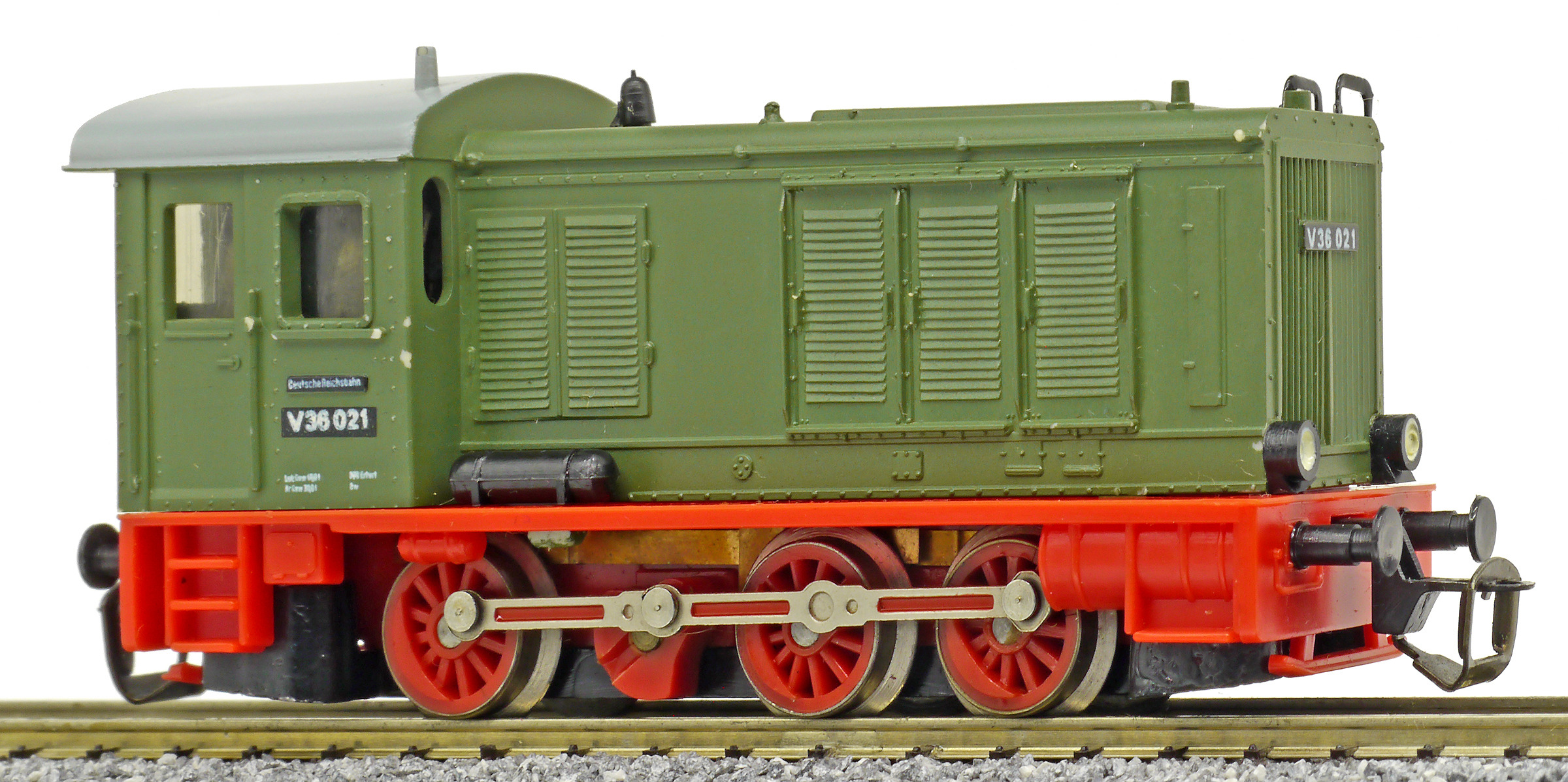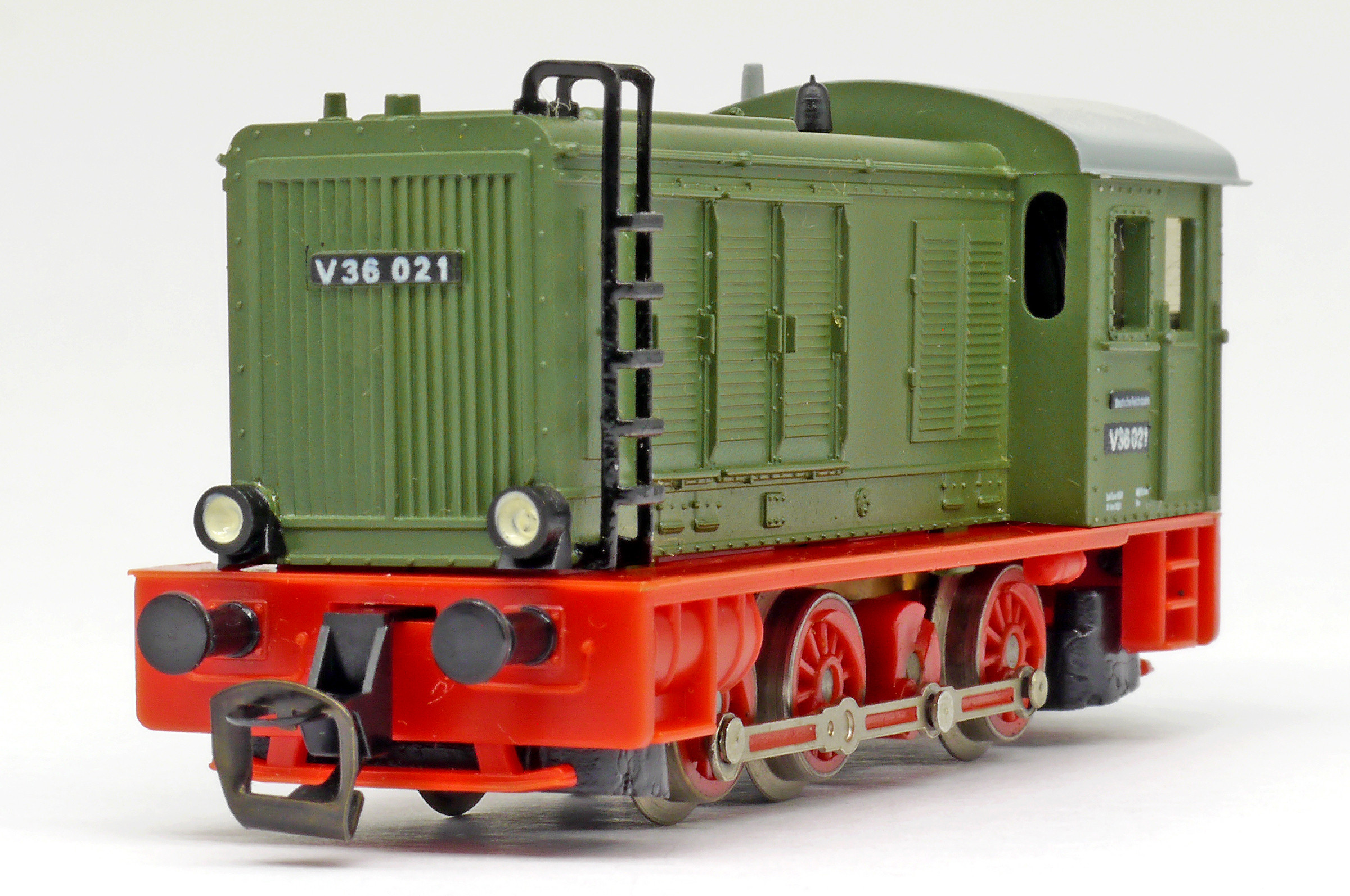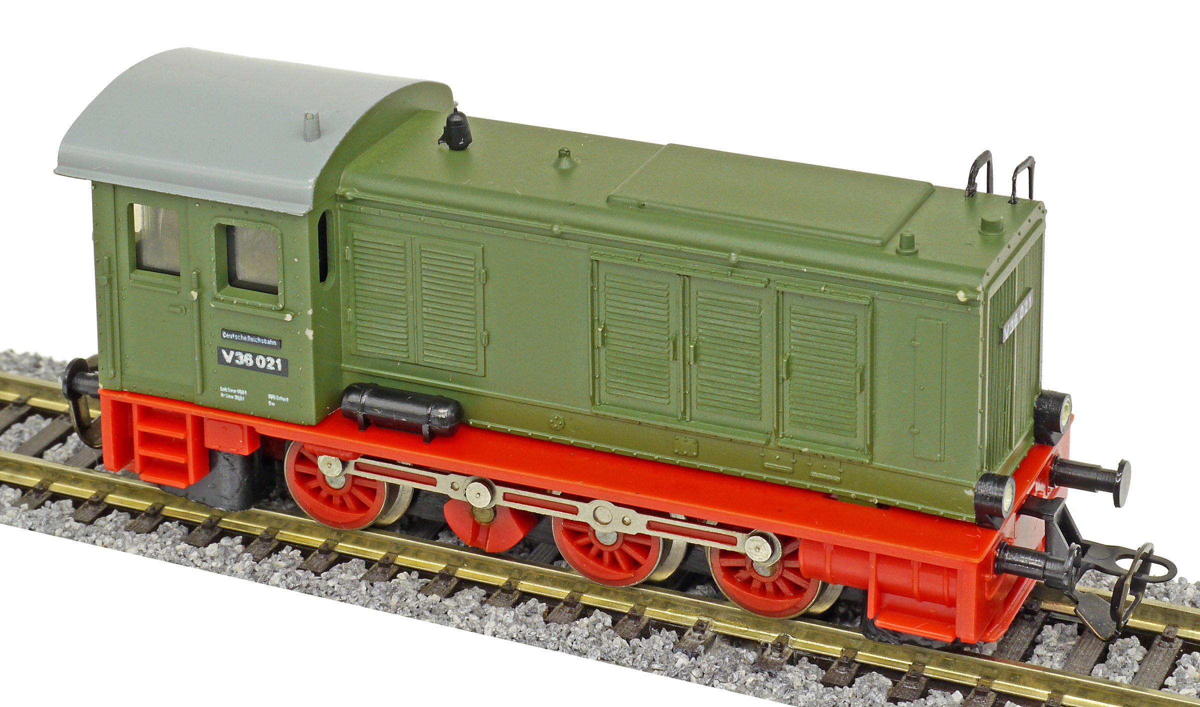 Kód   02601  [Lokomotivy] → [Motorové] → [V 36] → 02601: dieselová lokomotiva zelená s černým rámem, červená kola „Leuna Werke“