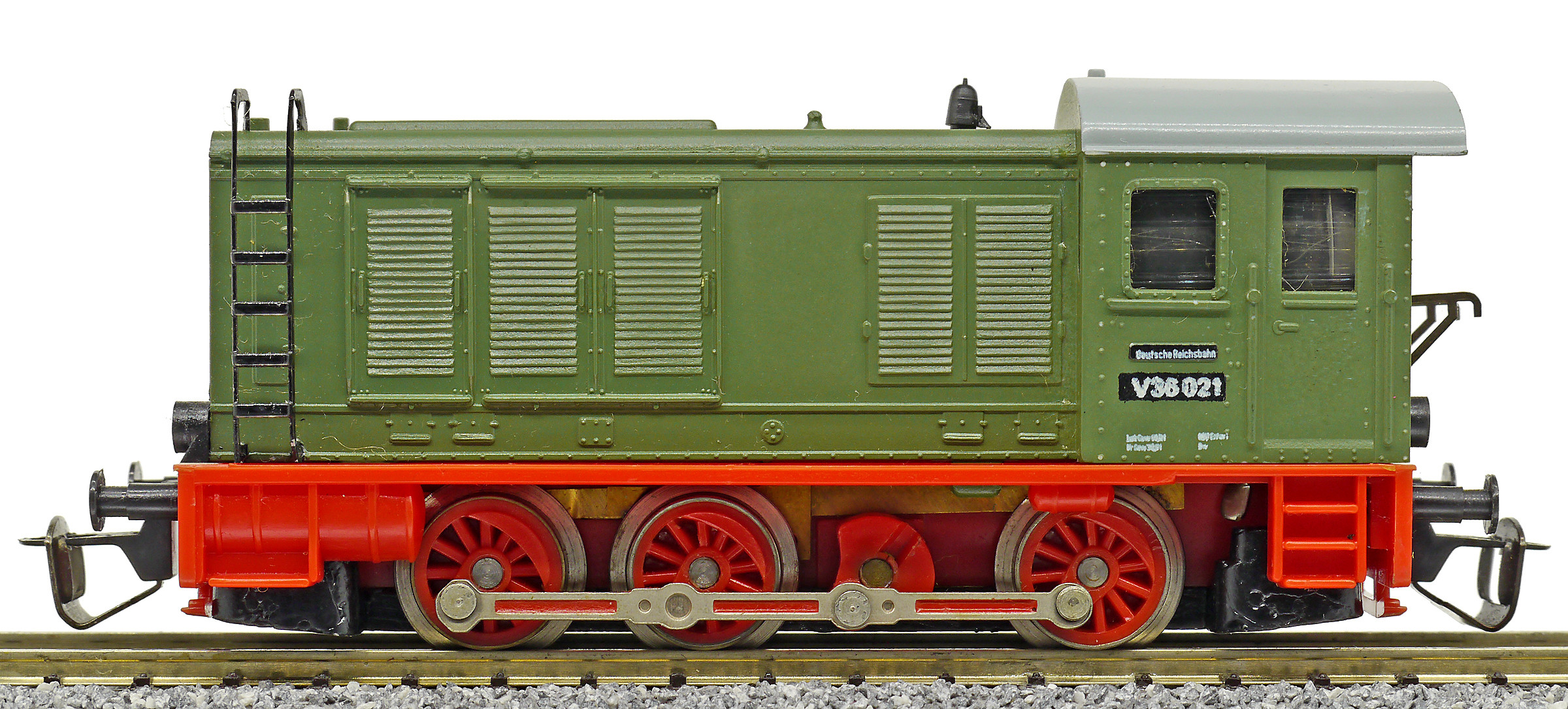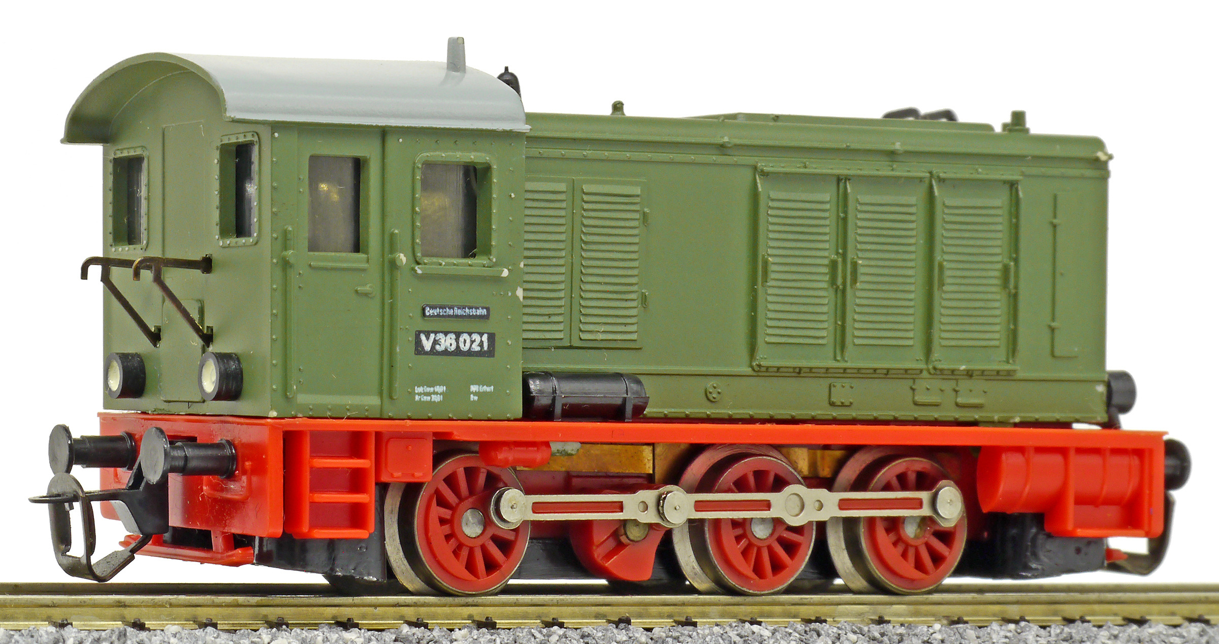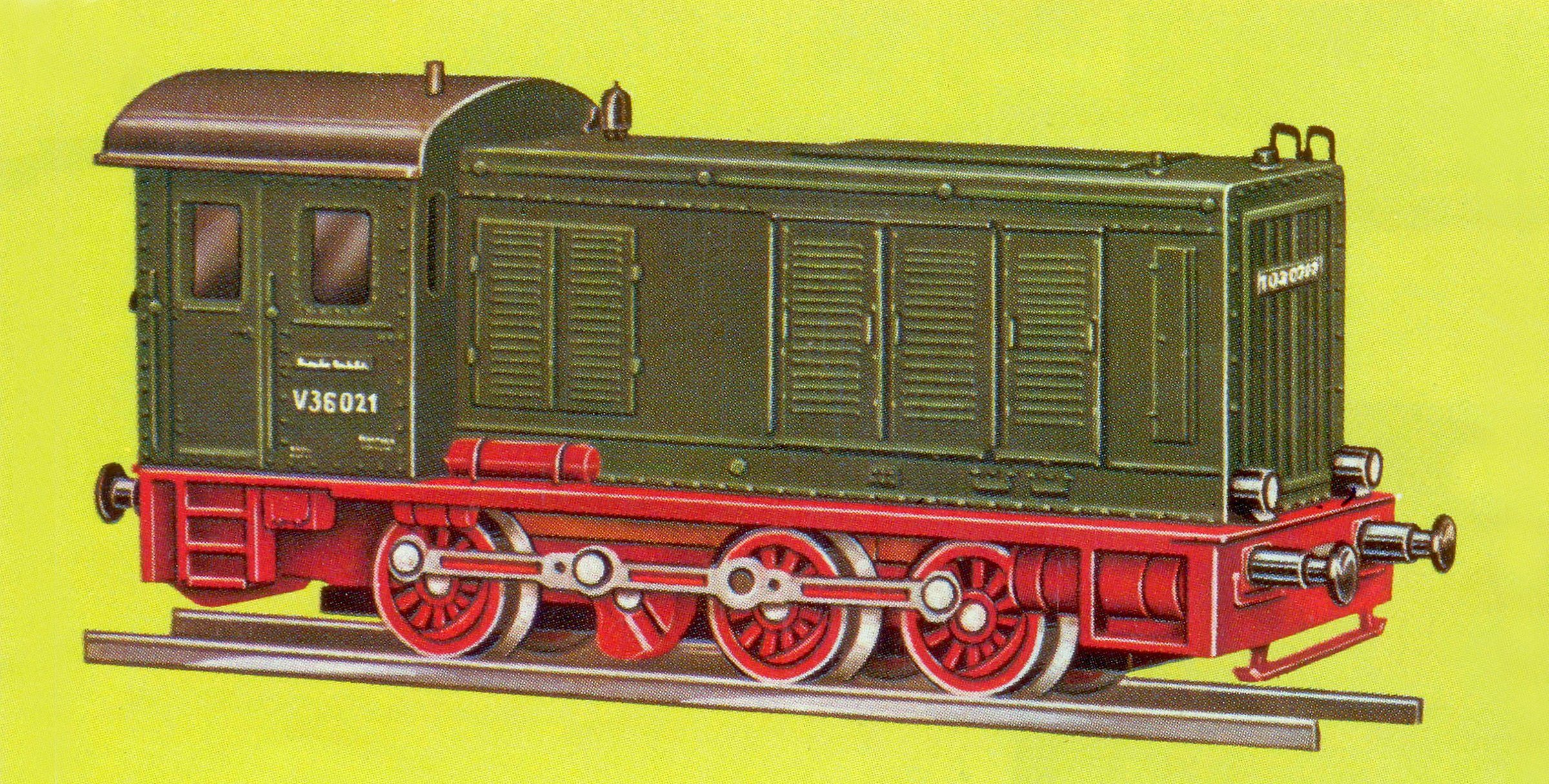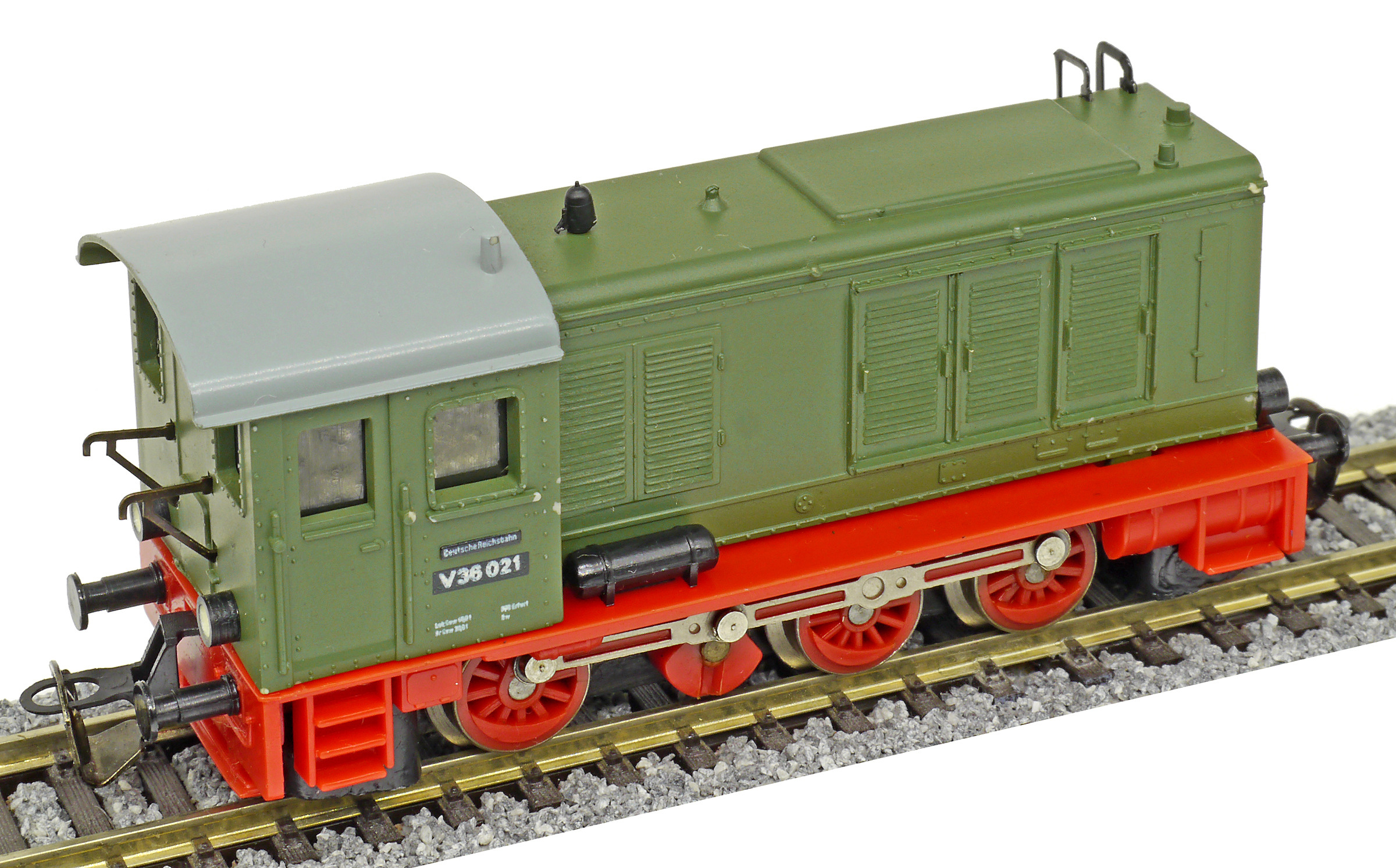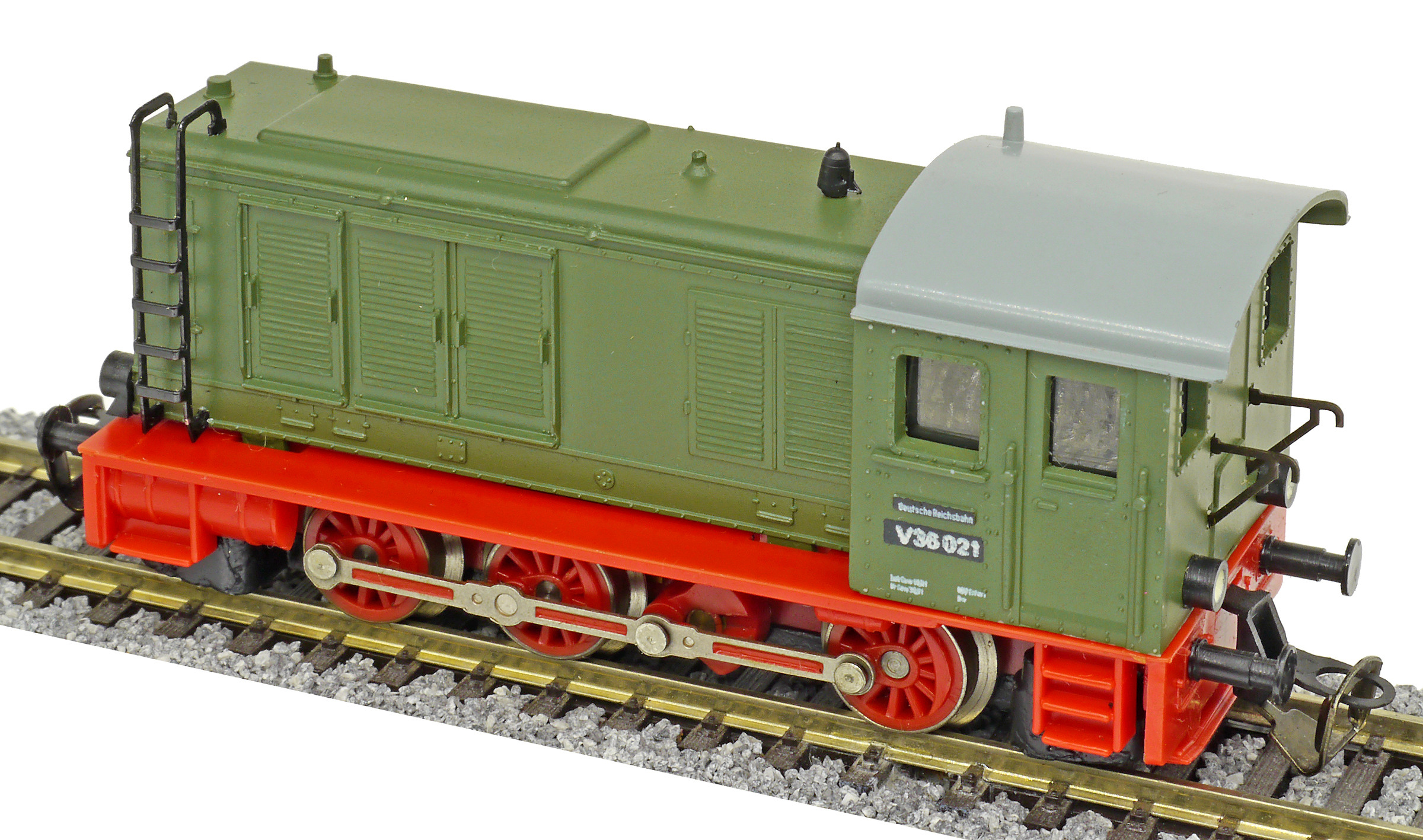 Kód   02601  [Lokomotivy] → [Motorové] → [V 36] → 02601: dieselová lokomotiva zelená s černým rámem, červená kola „Leuna Werke“