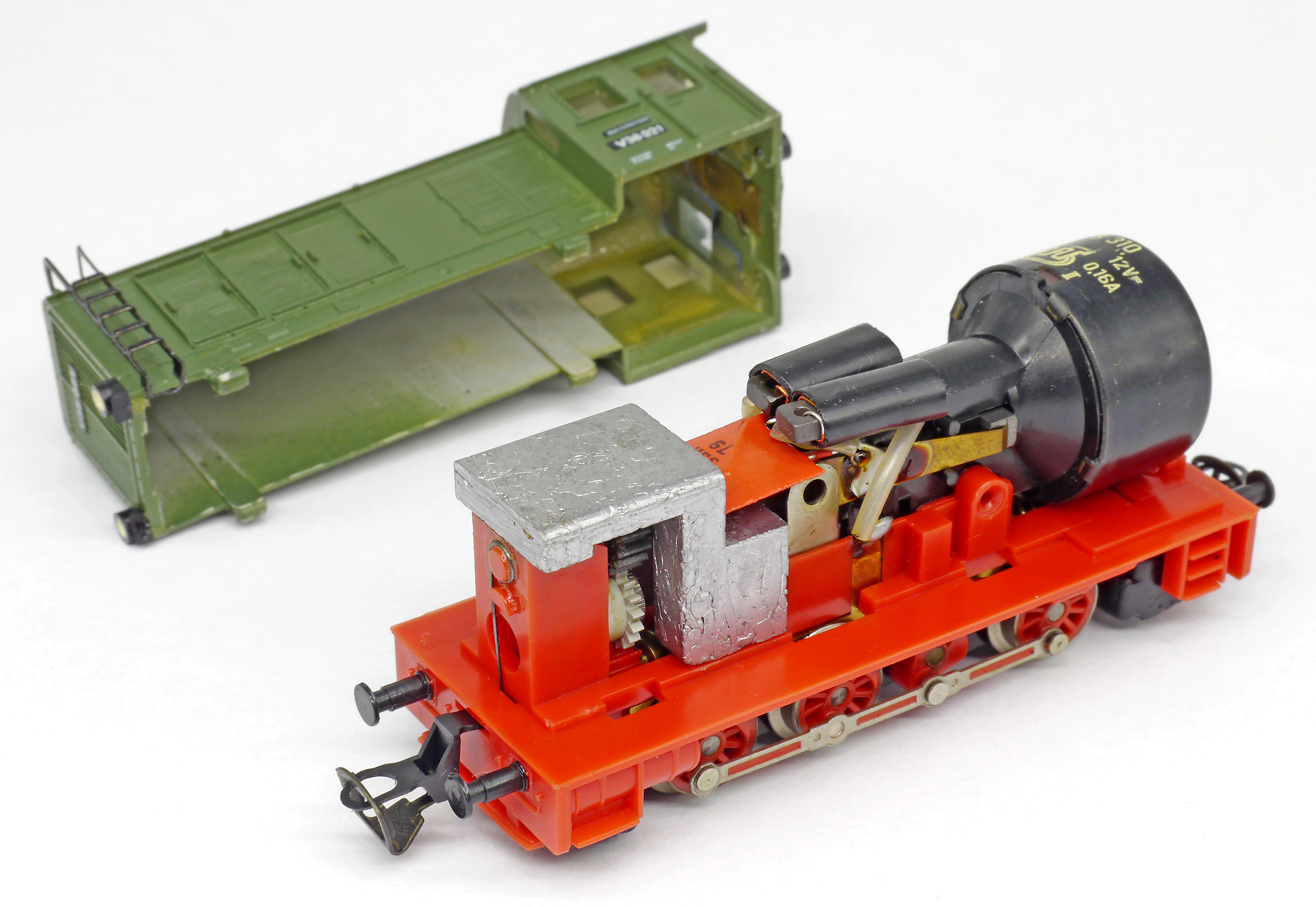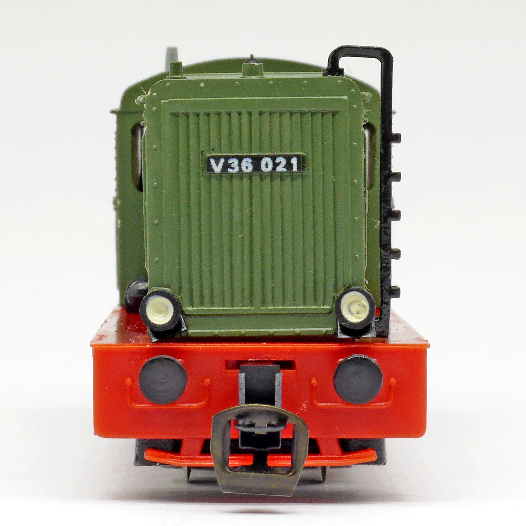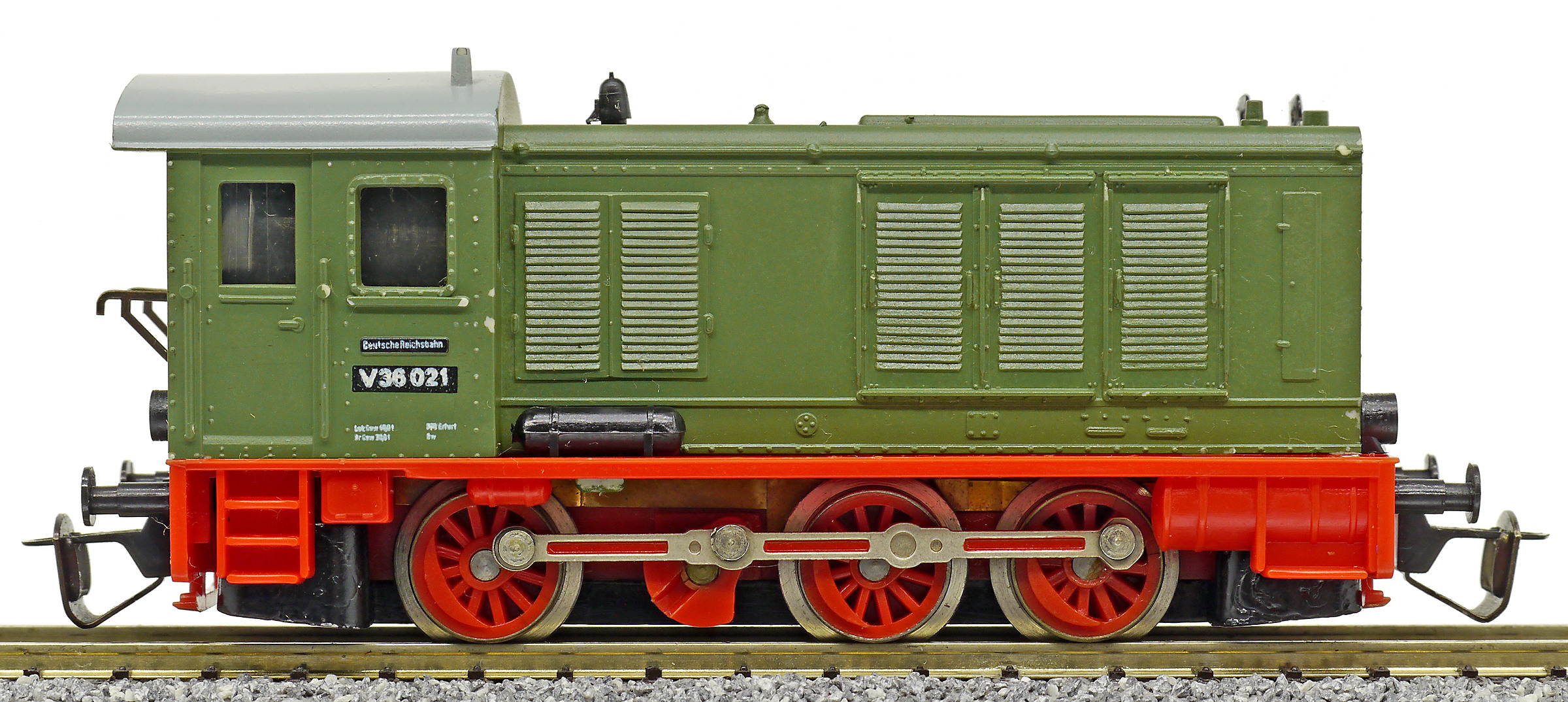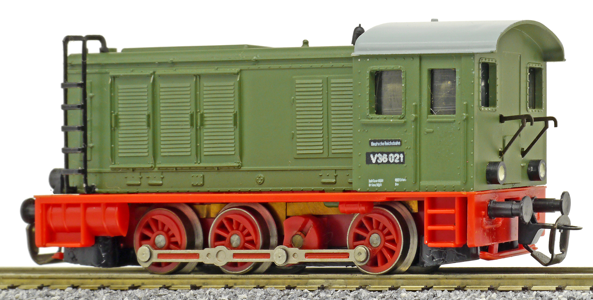 Kód   02601  [Lokomotivy] → [Motorové] → [V 36] → 02601: dieselová lokomotiva zelená s černým rámem, červená kola „Leuna Werke“
