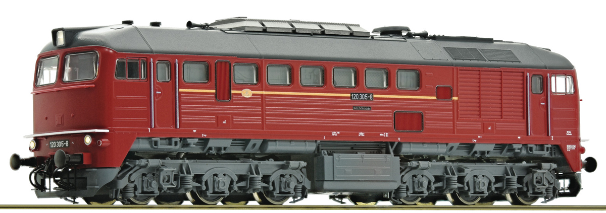 Kód   7390003  [Lokomotivy] → [Motorové] → [BR 120] → 7390003: dieselová lokomotiva tmavě červená, šedá střecha a černý pojezd