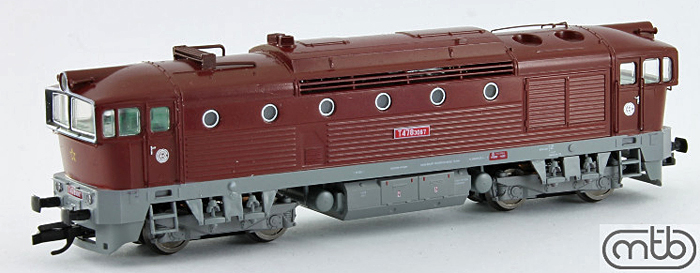 Kód   TT750-088  [Lokomotivy] → [Motorové] → [T478.3 „Brejlovec”] → TT750-088: dieselová lokomotiva vínově červená s výstražným pásem, šedé podvozky
