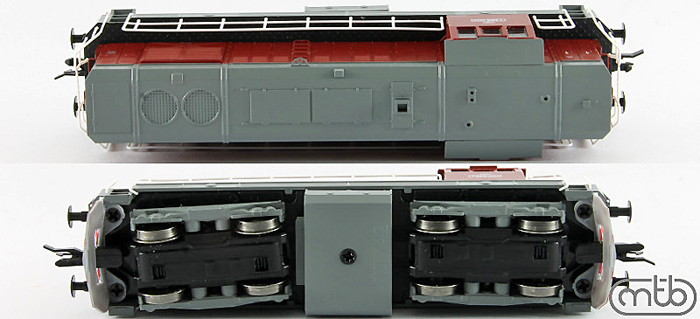 Popis   dieselová lokomotiva červená s šedou střechou, rámem a pojezdem