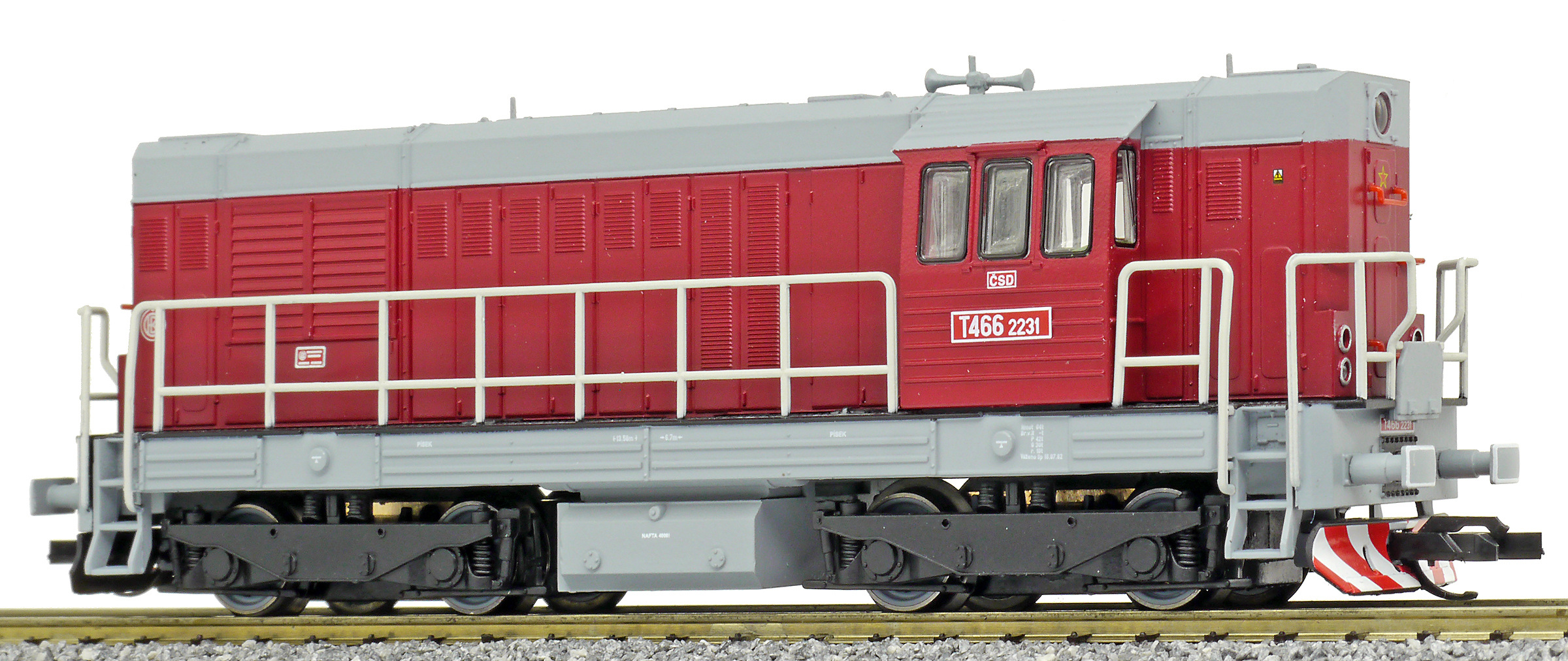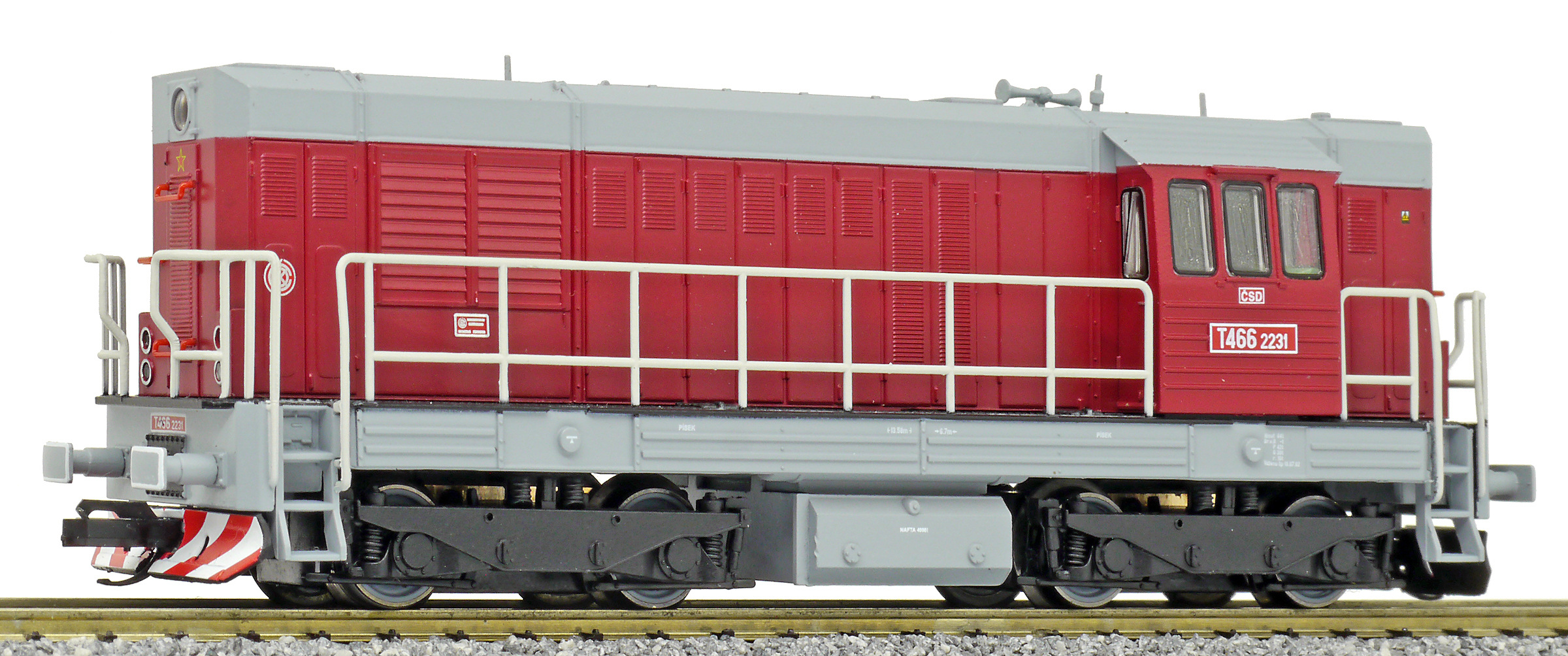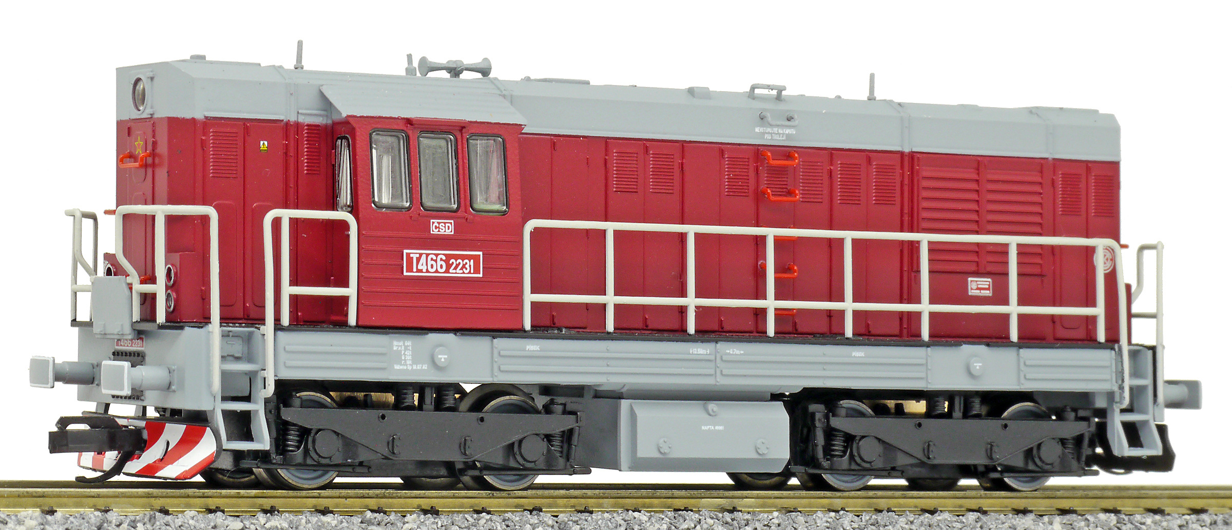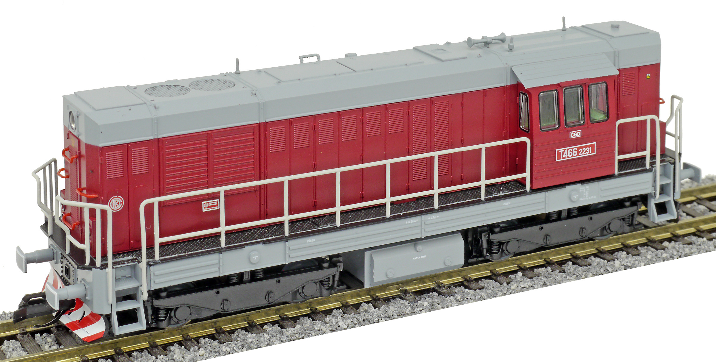 Kód   CSD-T466-2231  [Lokomotivy] → [Motorové] → [T466.2/T448.0] → CSD-T466-2231: dieselová lokomotiva červená s šedou střechou, rámem a pojezdem