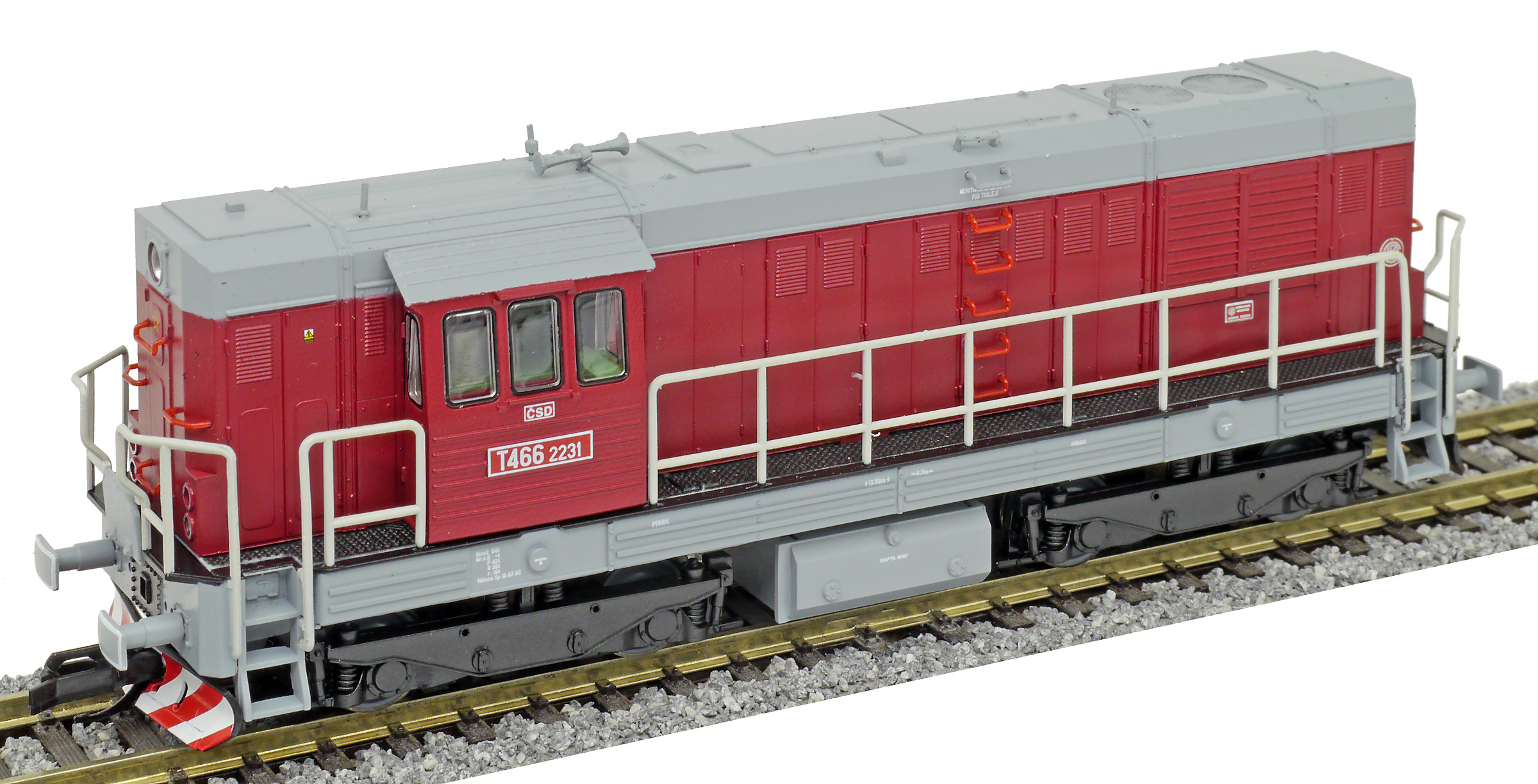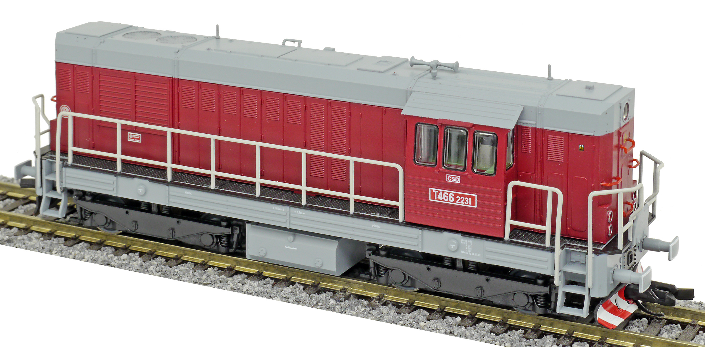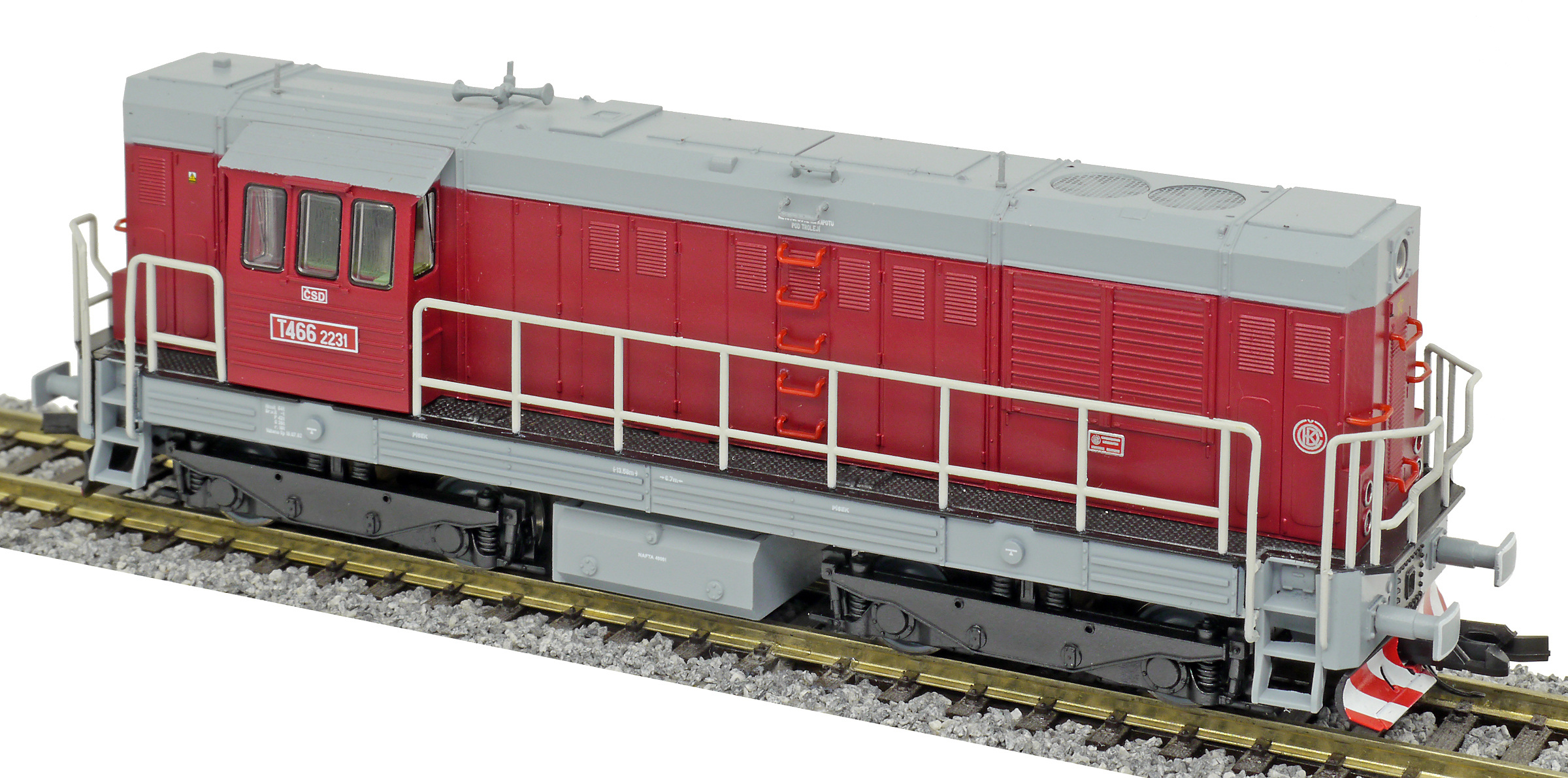 Kód   CSD-T466-2231  [Lokomotivy] → [Motorové] → [T466.2/T448.0] → CSD-T466-2231: dieselová lokomotiva červená s šedou střechou, rámem a pojezdem