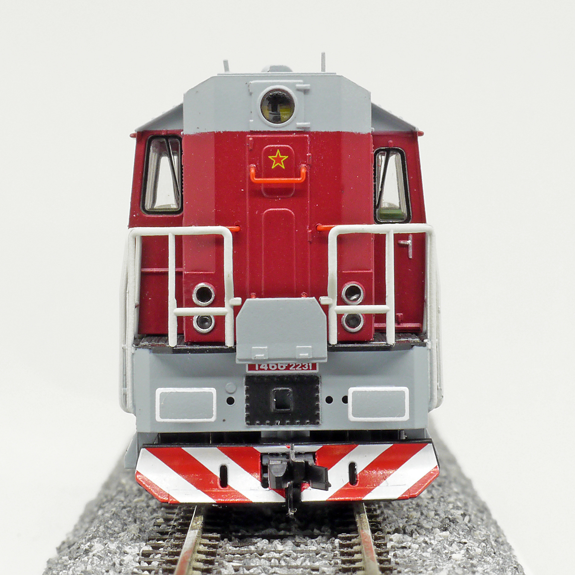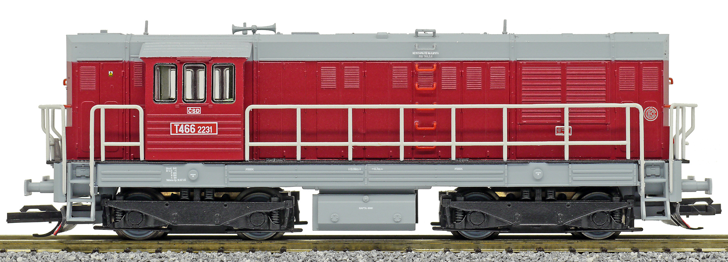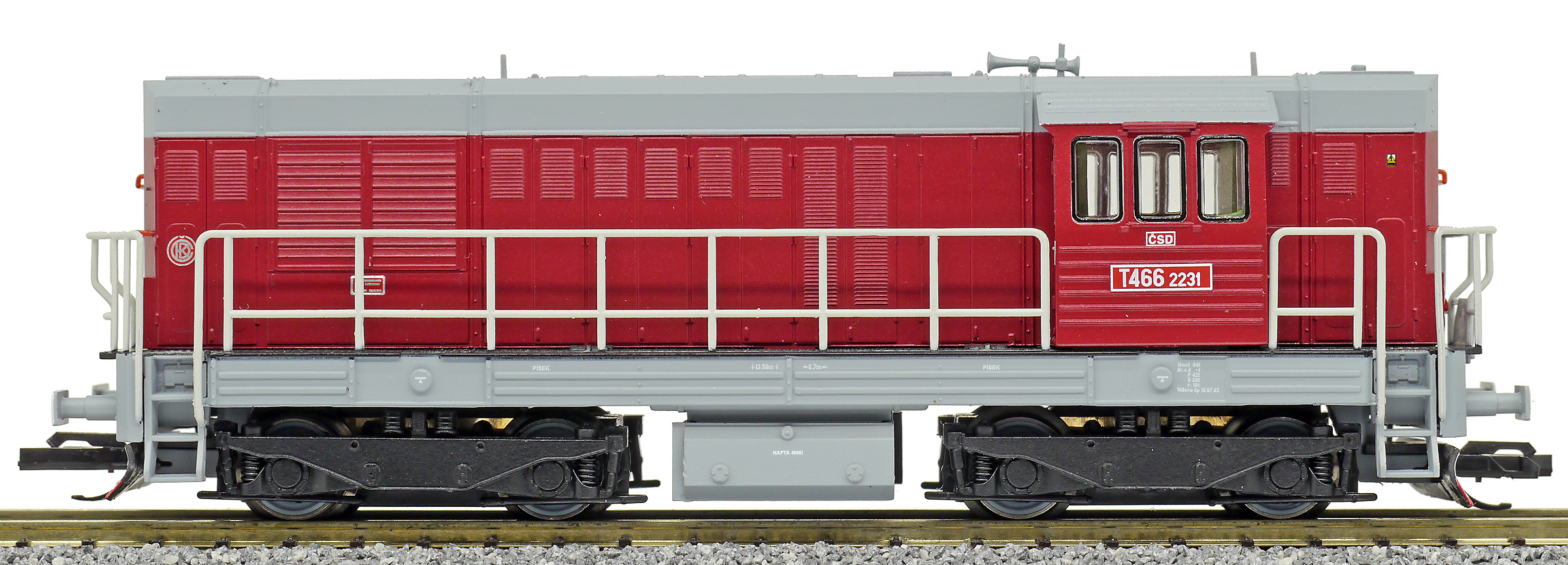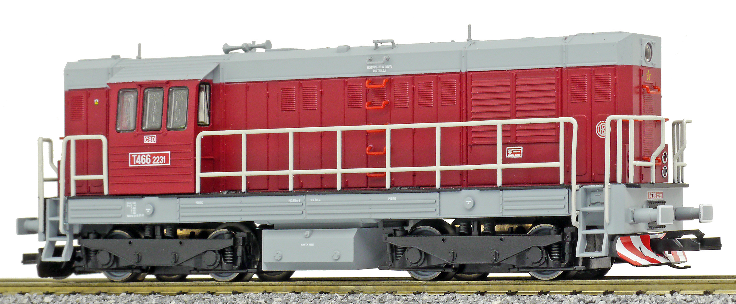Kód   CSD-T466-2231  [Lokomotivy] → [Motorové] → [T466.2/T448.0] → CSD-T466-2231: dieselová lokomotiva červená s šedou střechou, rámem a pojezdem