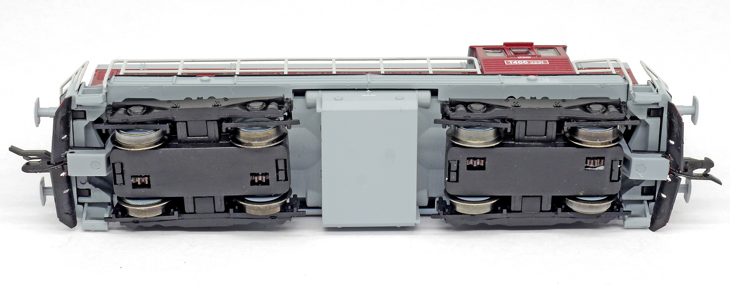 Kód   501828  [Lokomotivy] → [Motorové] → [T466.2/T448.0] → 501828: dieselová lokomotiva červená-šedá střecha, rám a pojezd