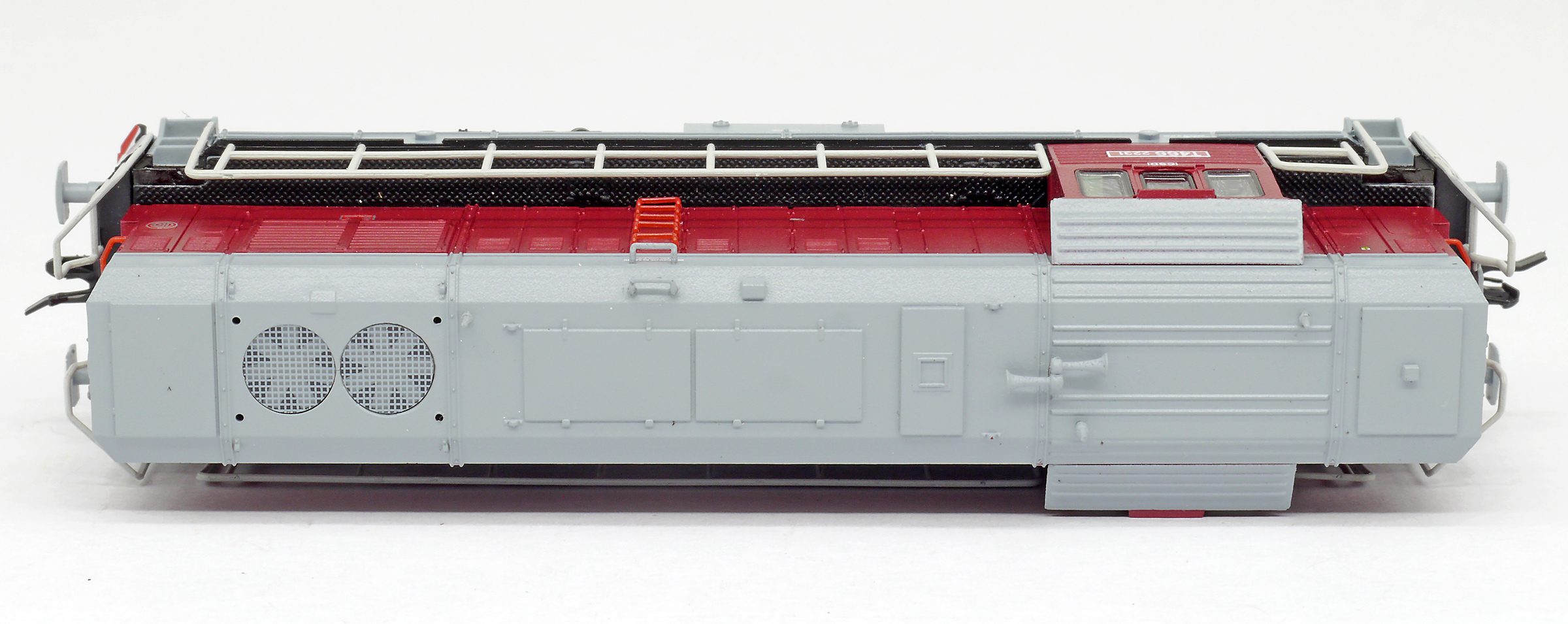 Popis   dieselová lokomotiva červená-šedá, bílé zábradlí