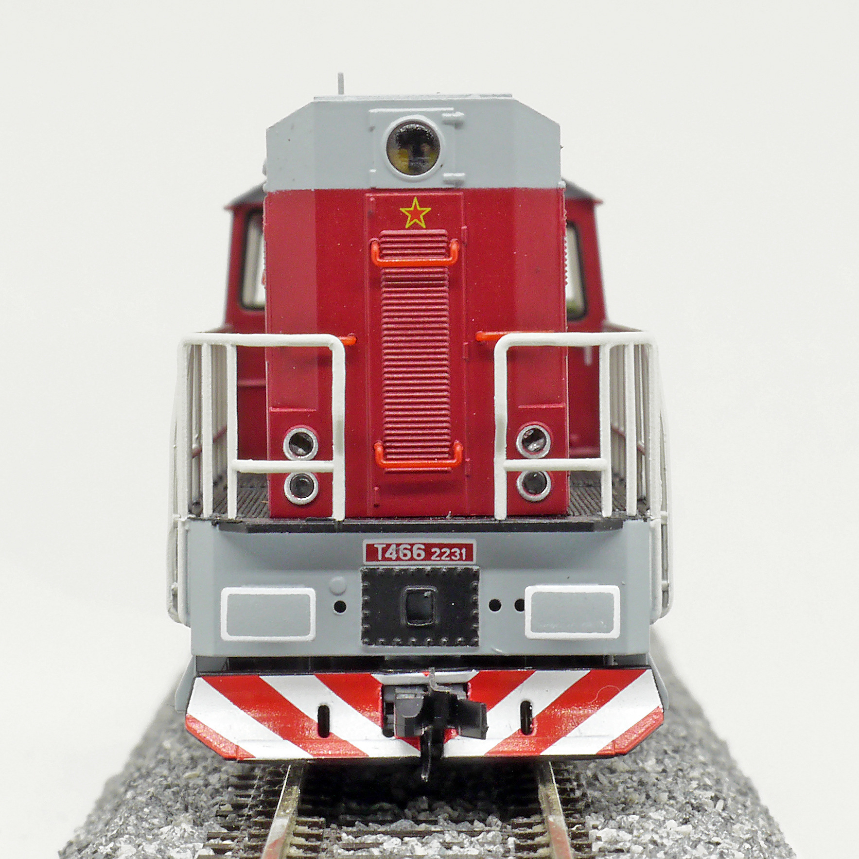 Kód   TT742-017   [Lokomotivy] → [Motorové] → [T466.2/T448.0] → TT742-017 : dieselová lokomotiva červená s šedou střechou, rámem a pojezdem a výstražným pruhem