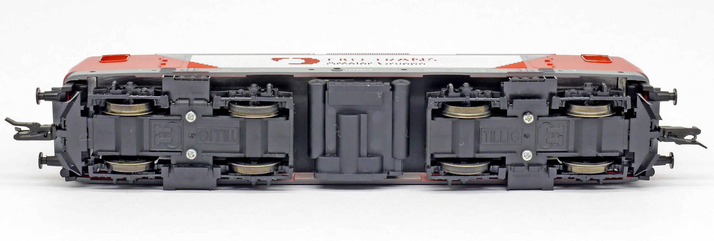 Kód   47491  [Lokomotivy] → [Elektrické] → [BR 143] → 47491: elektrická lokomotiva červená s bílým proužkem, šedé podvozky