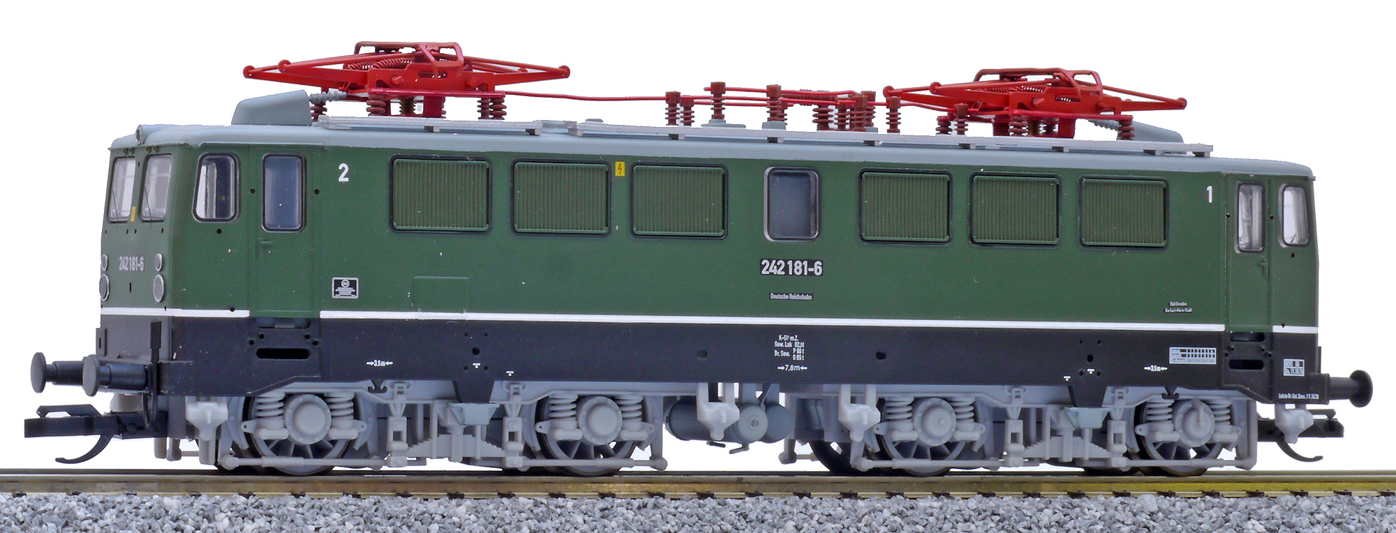 Kód   500523  [Lokomotivy] → [Elektrické] → [BR 242] → 500523: elektrická lokomotiva zelená s černým rámem, šedá střecha a červené podvozky